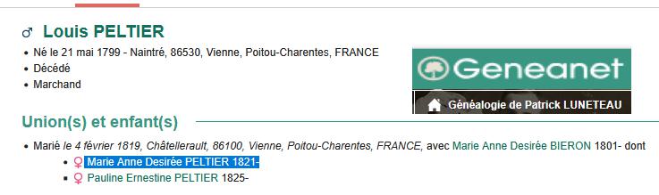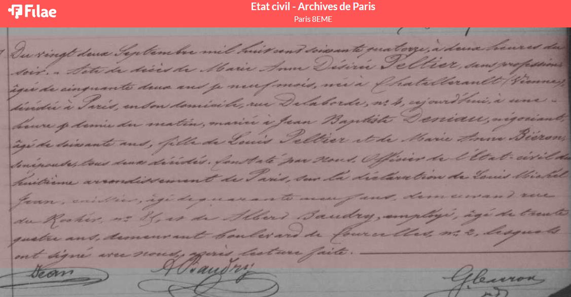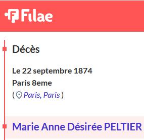 Mme Désirée DENIAU née PELTIER décédée à PARIS le 22 Septembre 1874 dans sa 52ème année |