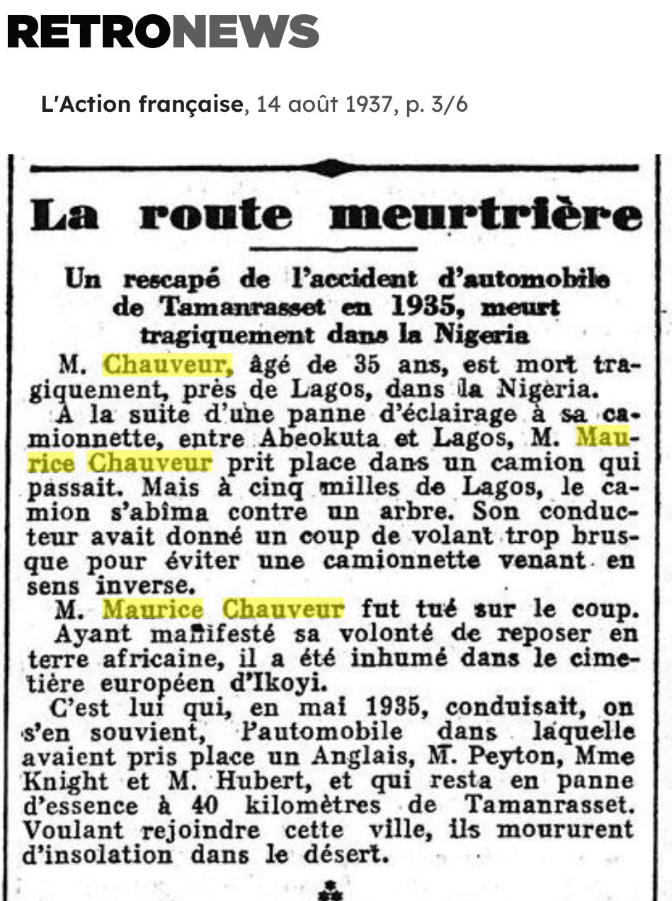 A LA MEMOIRE DE MAURICE CHAUVEUR TUE ACCIDENTELLEMENT A LAGOS (Nigéra) LE 3 JUILLET 1937 ET INHUME DANS LE CIMETIERE EUROPEEN D'IKOYI 1901 - 1937 |