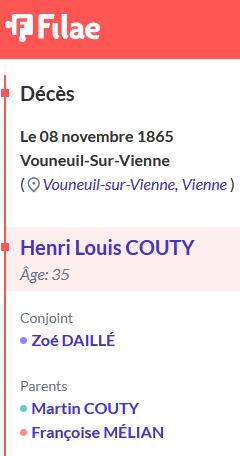 LE CORPS DE HENRI LOUIS COUTY NOTAIRE A VOUNEUIL SUR VIENNE DECEDE LE 8 NOVEMBRE 1865 A L'AGE DE 35 ANS – IL FUT BON EPOUX ET BON PERE