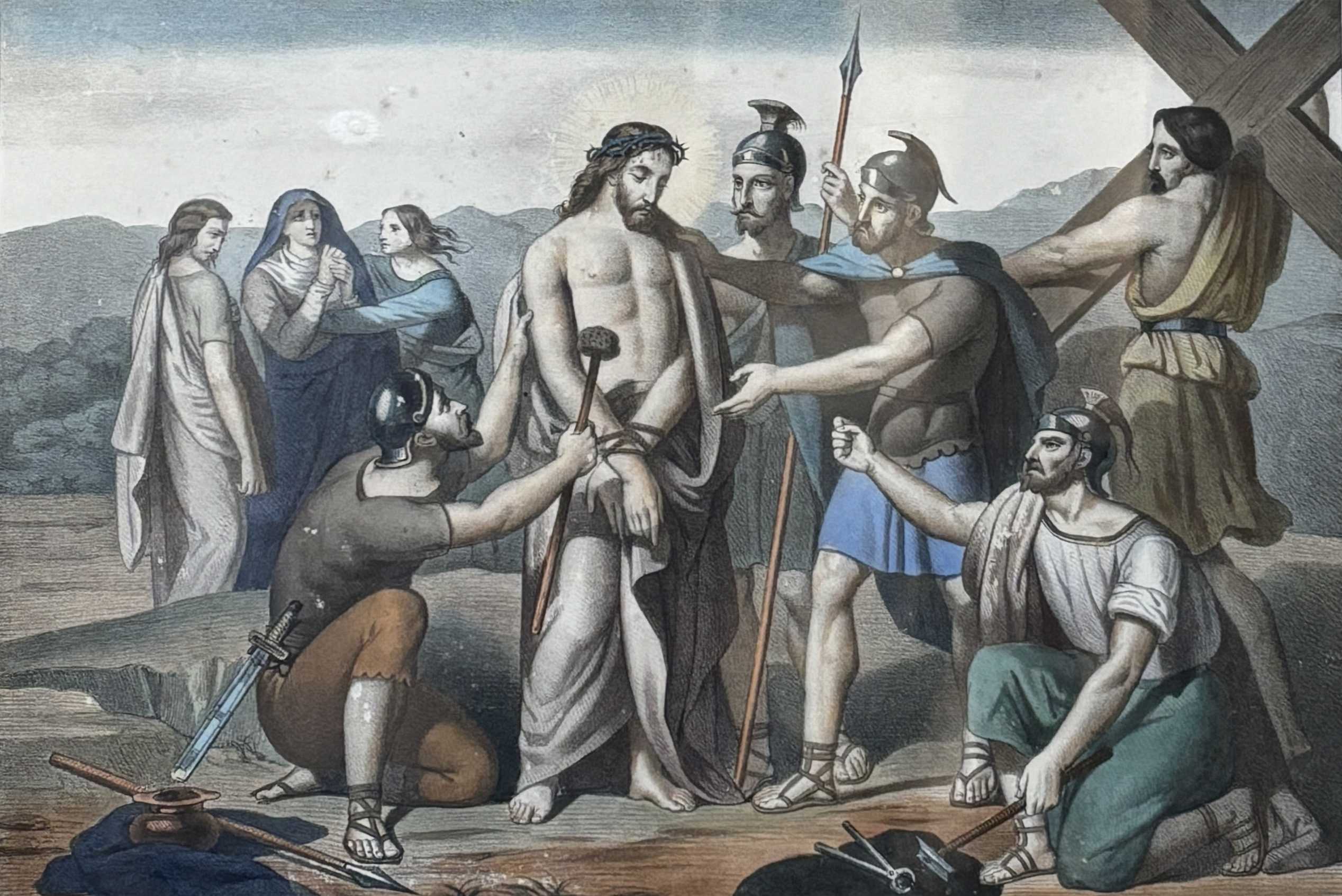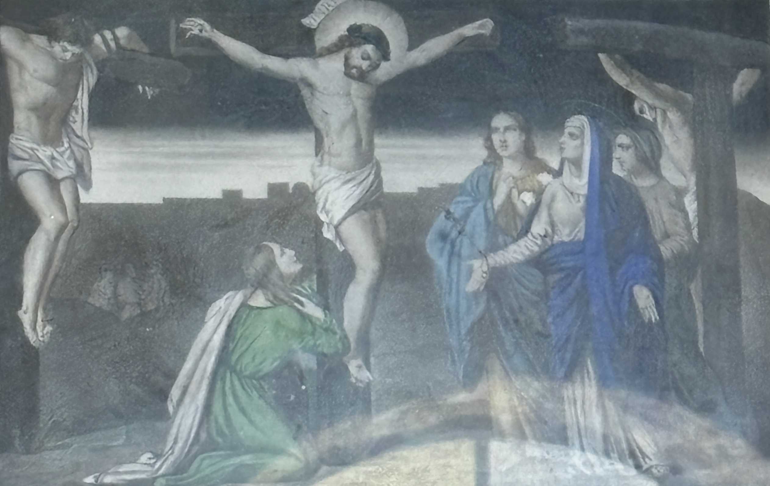 Autorisation d’ériger les stations du chemin de la croix dans l’église paroissiale d’Ardilleux, 25 août 1938 Ce chemin de croix réalisé en lithographie sur papier, est composé de 14 estampes de format rectangulaire vertical encadrées sous verre. Le cadre est en bois mouluré. Ce cadre est surmonté d'une croix. |
