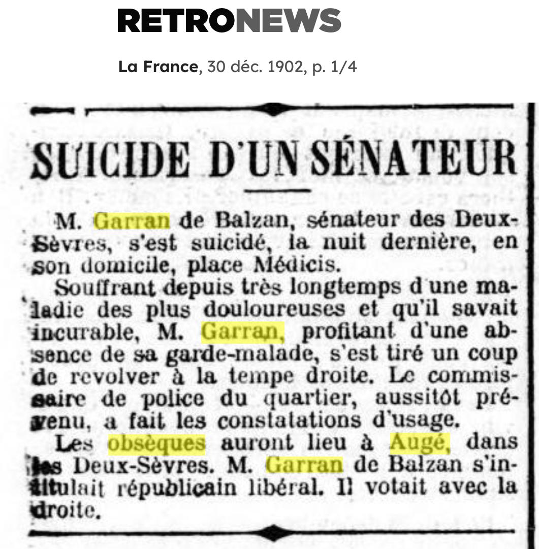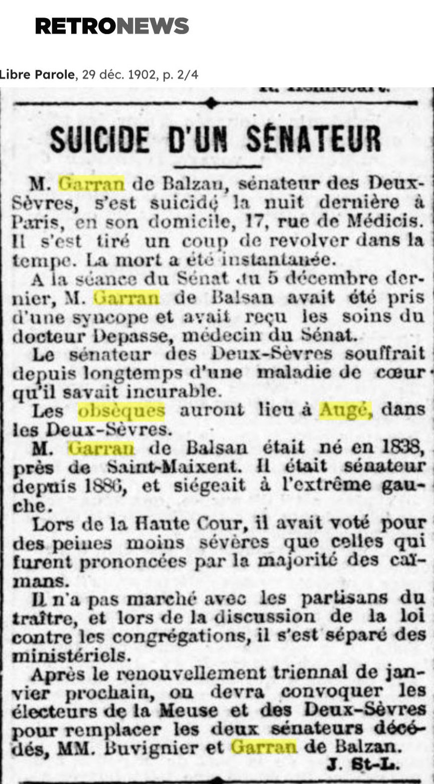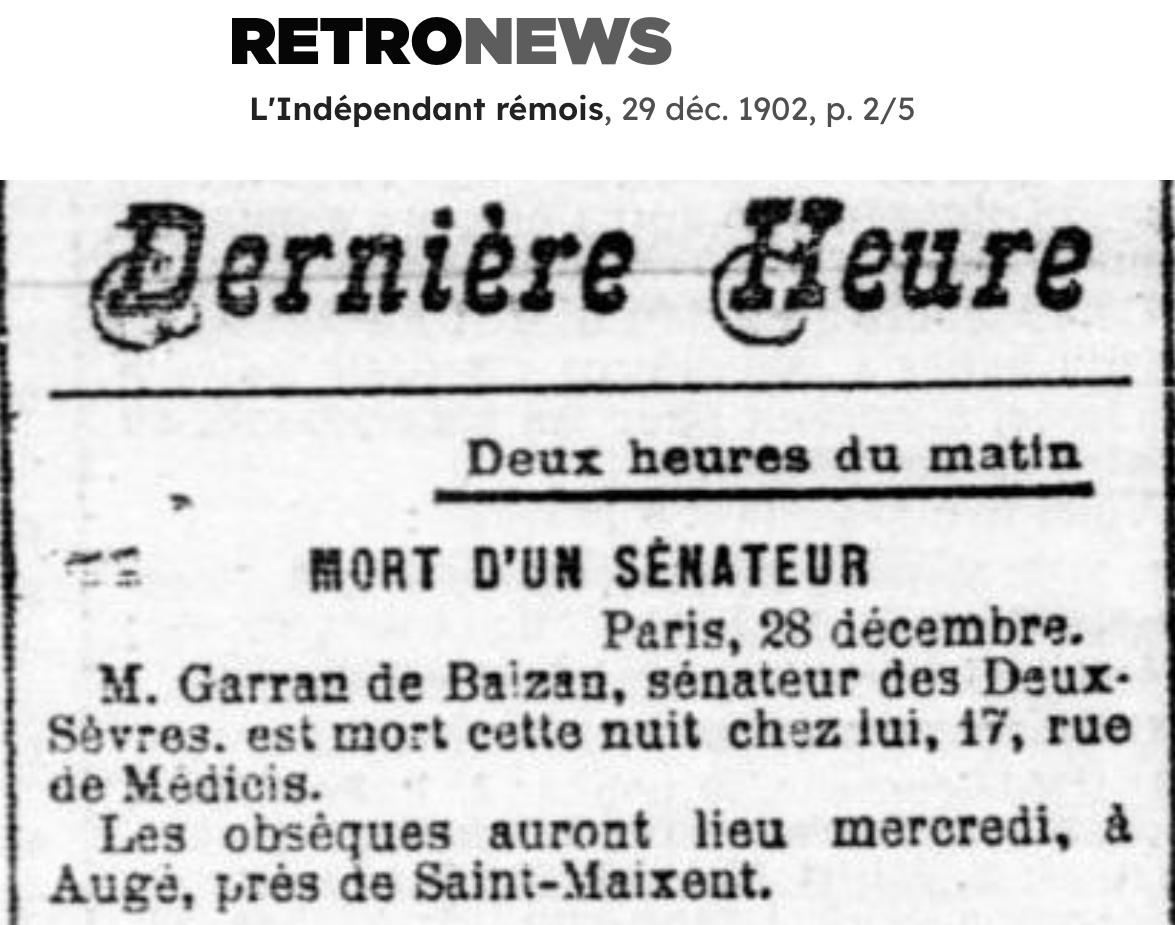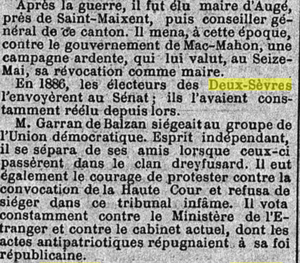 GARRAN DE BALZAN FRANCOIS GABRIEL EMILE NE A ST MAIXENT LE 30 JANVIER 1838 DECEDE A PARIS LE 28 DECEMBRE 1902 SENATEUR DES DEUX-SEVRES 1886-1902 REPUBLICAIN LIBRE PENSEUR. IL FUT LE PLUS HONNÊTE DES HOMMES |