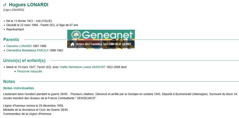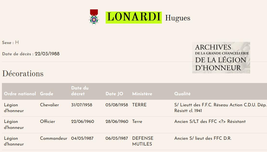 Hugues LONARDI né le 13/02/1921 à ASTI (Italie) est un grand résistant 39/45 membre des Forces Françaises Combattantes (FFC) et des Déportés Internés Résistants (DIR)