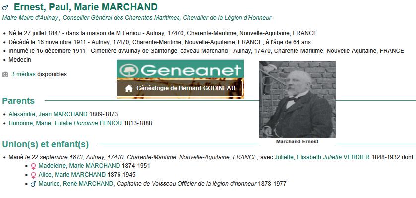 Parents : Ernest, Paul, Marie MARCHAND, Maire d'Aulnay Conseiller Général des Charentes Maritimes 1847-1911 Juliette, Elisabeth Juliette VERDIER 1848-1932