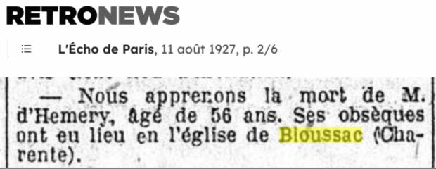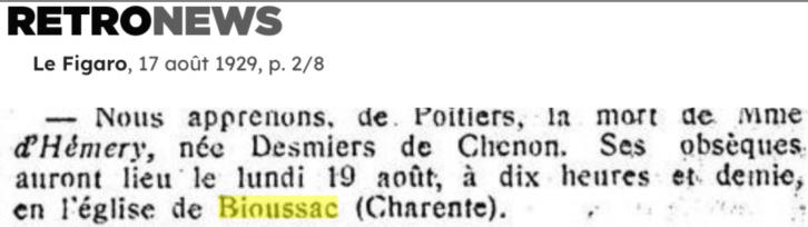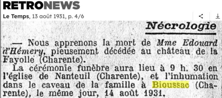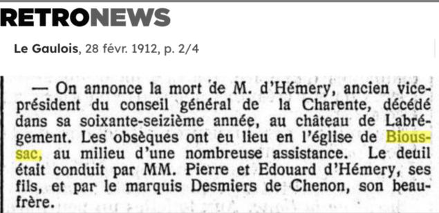 ICI REPOSENT FERDINAND POL D'HEMERY 5 JANVIER 1837 – 22 FEVRIER 1912 CONSTRUCTEUR DE L'EGLISE DE BIOUSSAC ET SON EPOUSE MARIE MATHILDE CECILE DESMIERS DE CHENON (15/09/1846 - ….) |