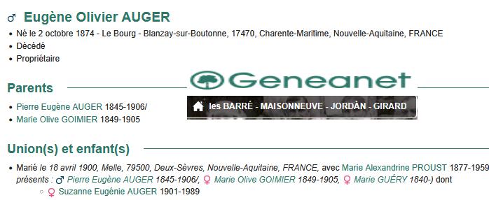 MARIE ALEXANDRINE PROUST EPOUSE OLIVIER AUGER 1877 – 1954 Mlle AUGER Suzanne 18.1.1901 – 8.12.1989 |