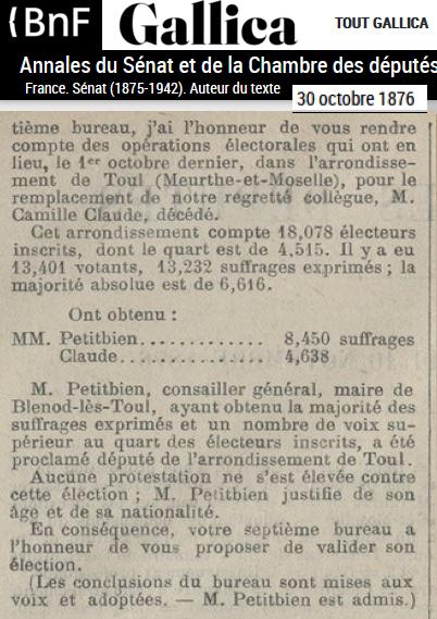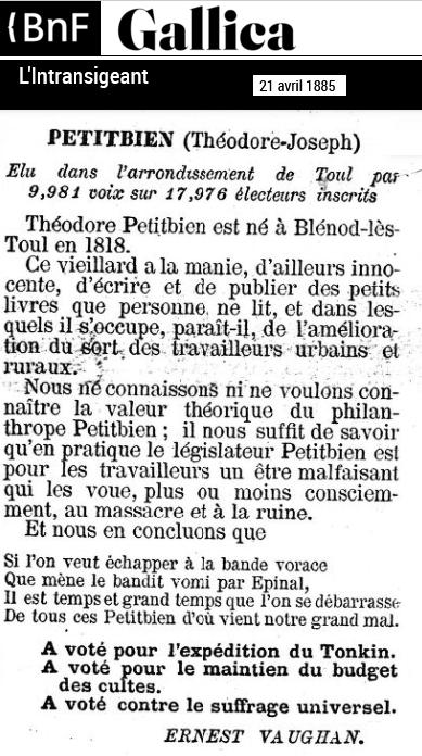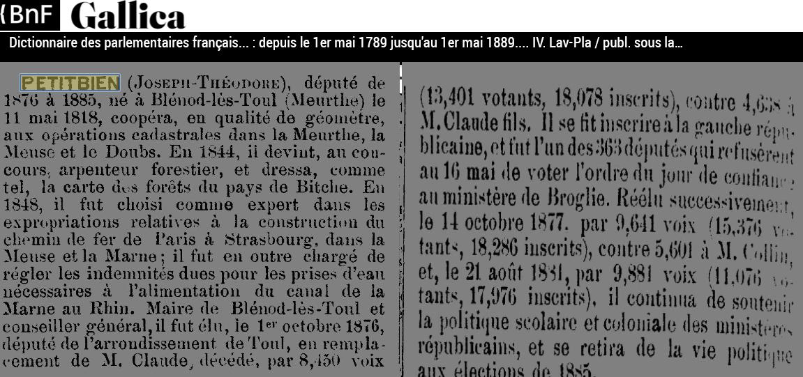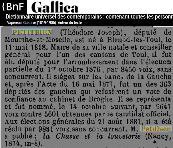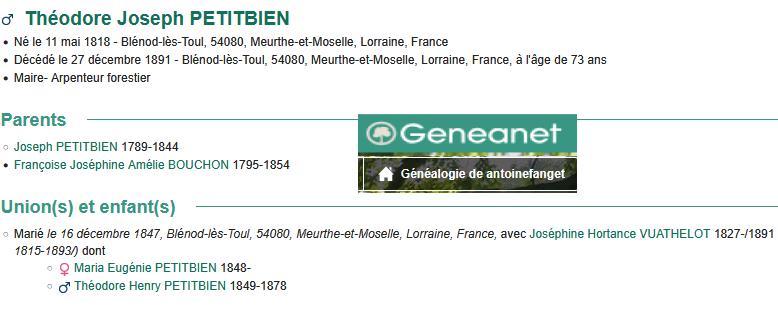 Joseph Théodore PETITBIEN Né le 11 mai 1818 - Blénod-Lès-Toul, 54 Décédé le 27 décembre 1891 - Blénod-Lès-Toul, 54, à l'âge de 73 ans Géomètre, arpenteur agricole et homme politique, maire de Blénod les Toul Parents Joseph PETITBIEN 1789-1844 Françoise Joséphine Amélie BOUCHON 1795-1854 Union et enfant(s) Marié le 16 décembre 1847, Blénod-Lès-Toul, 54, avec Eugénie Hortance VUATHELOT 1827-1859 dont F Maria Eugénie PETITBIEN 1848-1902 H Henri Théodore PETITBIEN 1849-1878