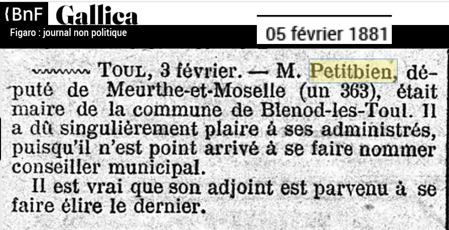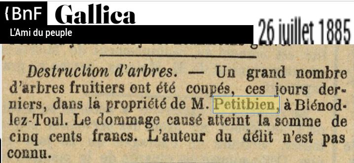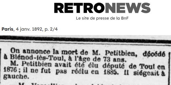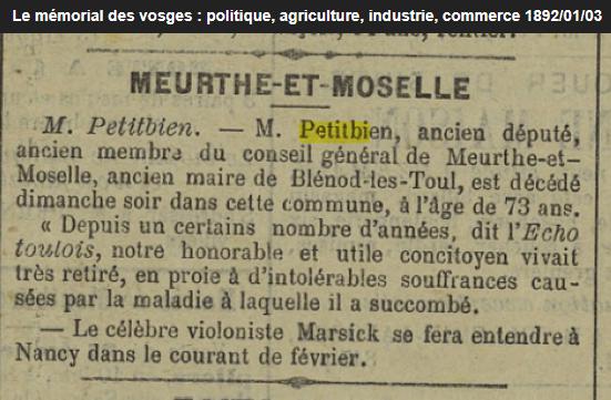 Autre Une rue de la commune de Blénod-lès-Toul porte son nom. Le caveau de la famille Petitbien est encore visible dans le vieux cimetière de son village natal.