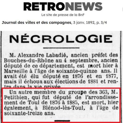 En 1885, Petitbien abandonne la vie publique et se retira dans son pays natal où y mourut le 27 décembre 1891, à l'âge de 73 ans.