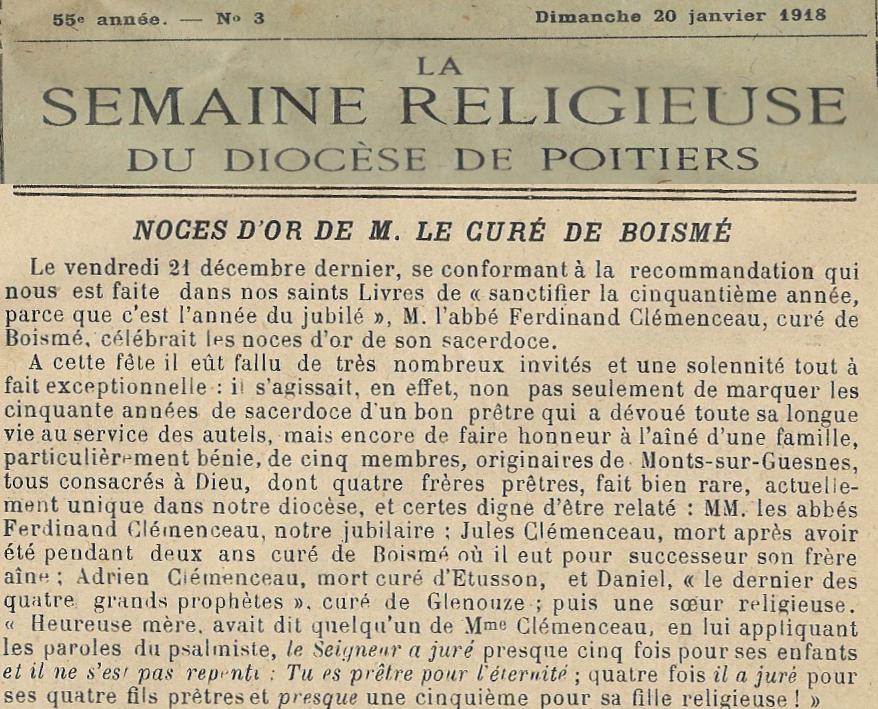 M. L'ABBE ADRIEN CLEMENCEAU CURE D'ETUSSON 1853 – 1913 – M. L'ABBE DANIEL CLEMENCEAU CURE DE GLENOUZE 1856 – 1936