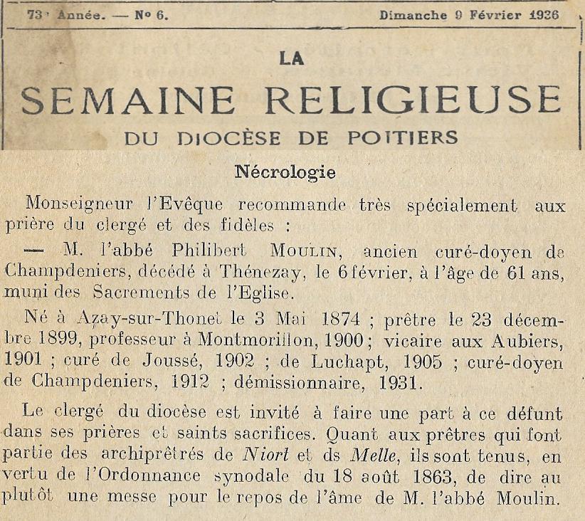 …. …. MOULIN CURE DOYEN DE CHAMPDENIER 19.. - 1931 .. DE SES PAROISSIENS RESQUIAT IN PACE |
