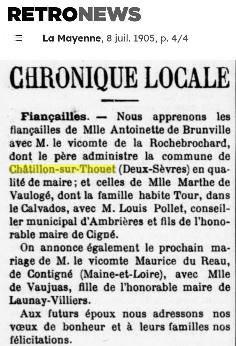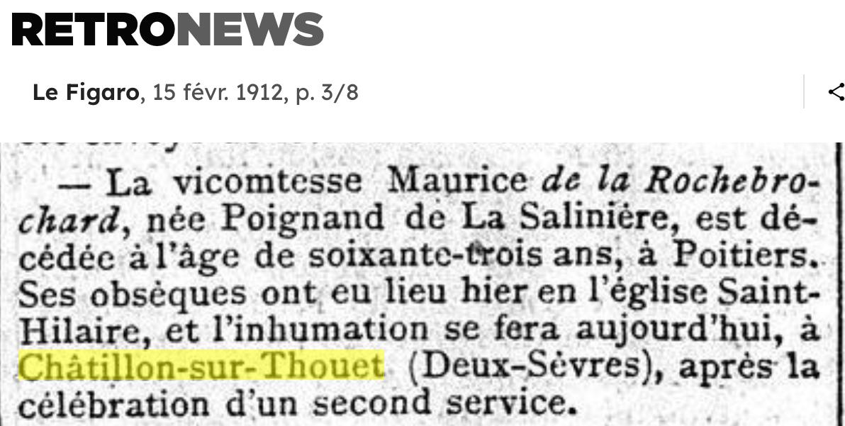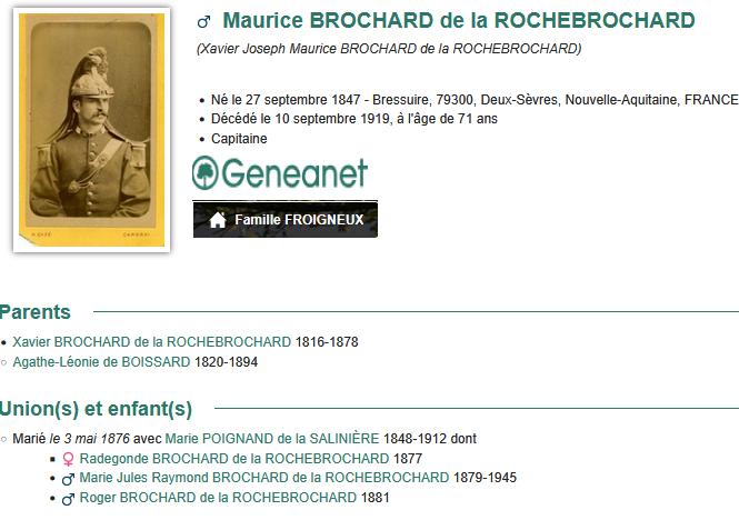Union Marié avec Marie Radegonde Delphine POIGNAND DU FONTENIOUX, née vers 1821, décédée (Parents : H Thomas Paulin POIGNAND DU FONTENIOUX 1787-1875 & F Marie NYVARD de COURGÉ 1787-/1875) dont Marie Alexandre Gabriel POIGNAND de LA SALINIÈRE 1848-1912 mariée le 8 mai 1876, Châtillon-sur-Thouet, 79200, Deux-Sèvres, Poitou-Charentes, FRANCE, avec Xavier Joseph Maurice de LA ROCHEBROCHARD, Vicomte de la Rochebrochard 1847-1919 …. source : |
