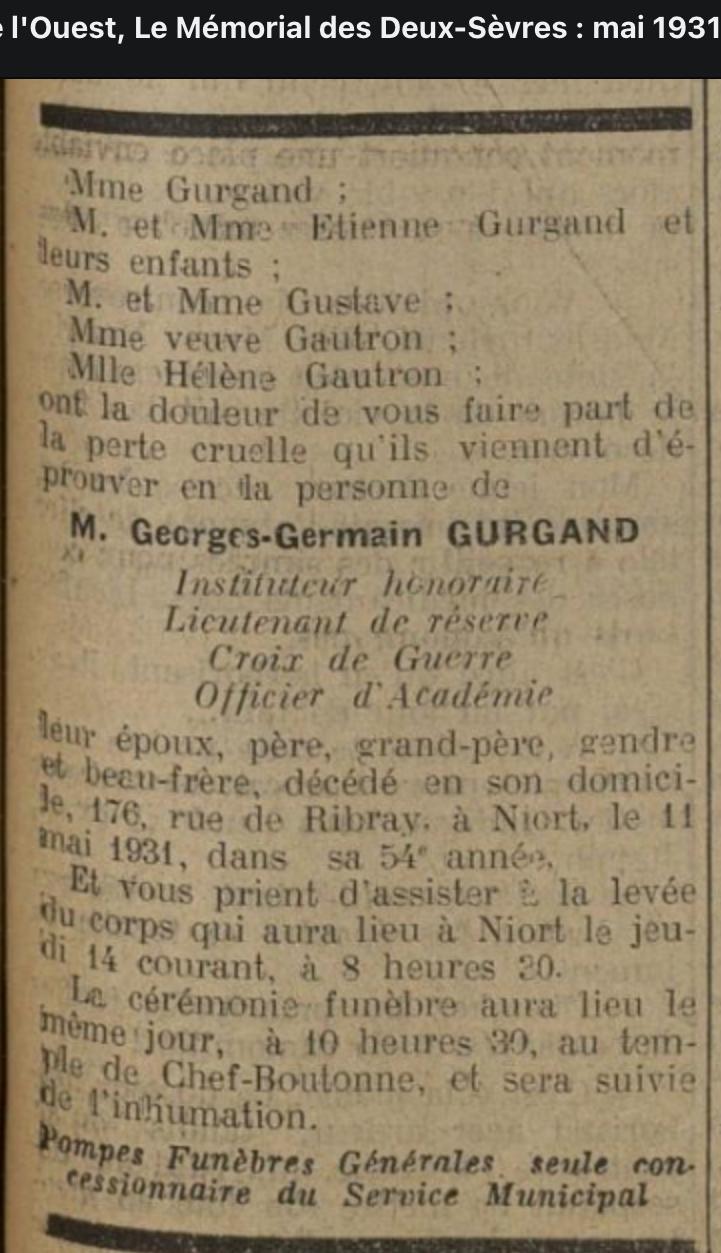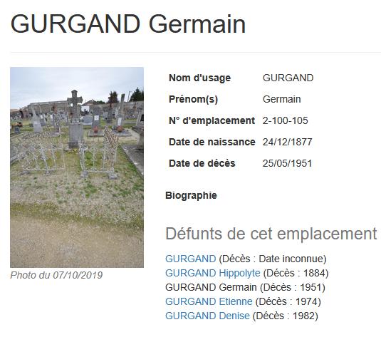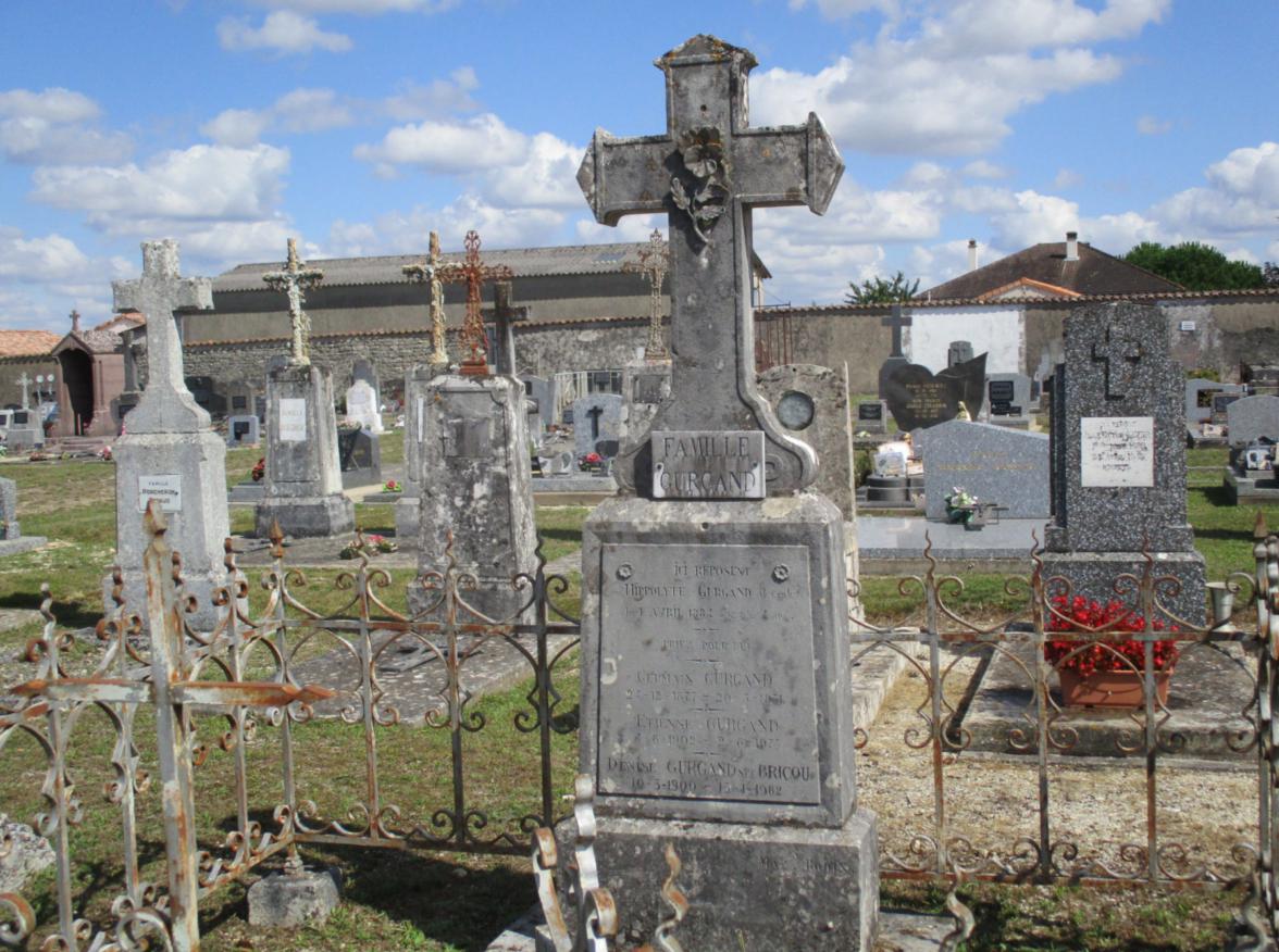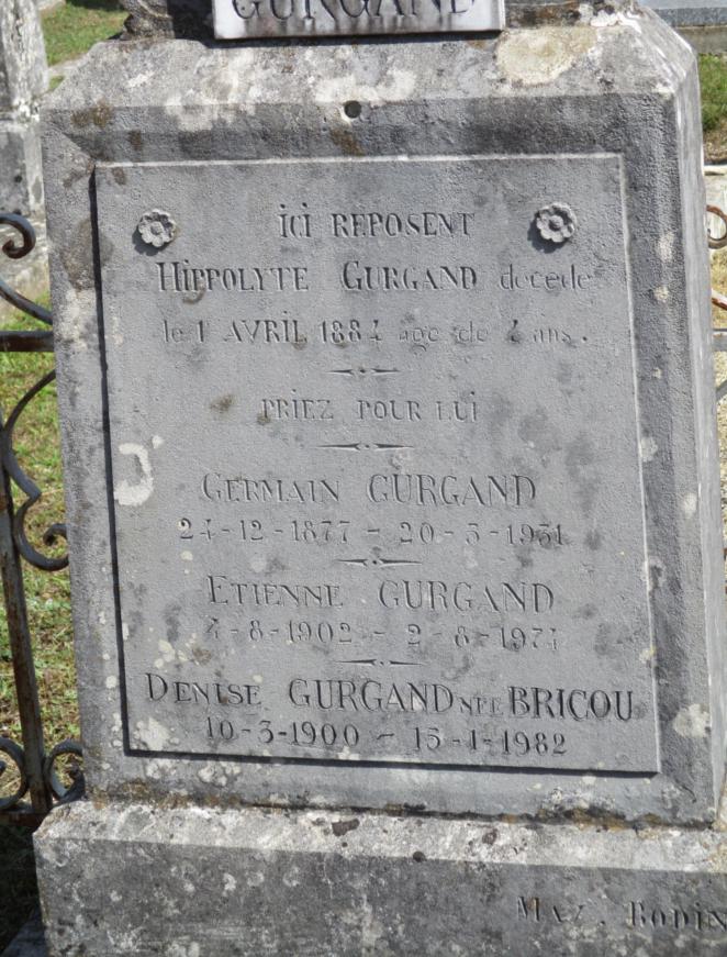 ICI REPOSENT HIPPOLYTE GURGAND décédé (Aristide à l'état civil) le 1 AVRIL 1884 âgé de 4ans – – GERMAIN GURGAND 24-12-1877 – 20-3-1931 – ETIENNE GURGAND 4-8-1902 - 2-8-1974 DENISE GURGAND NEE BRICOU 10-3-1900 - 15-1-1982 |