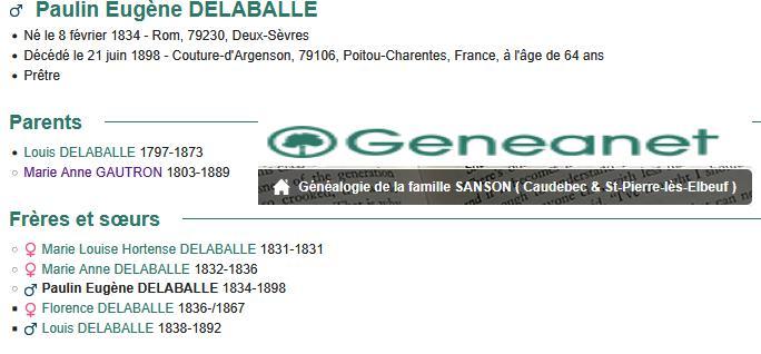 DELABALLE Paulin né à ROM en 1834 Oncle de GAUTRON Delphin (curé de COUTURE en 1898) DCD à COUTURE le 21/06/1898