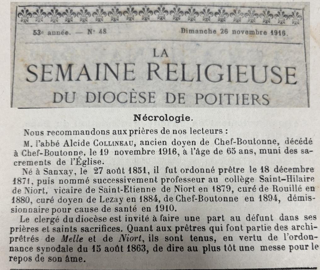 COLLINEAU Alcide était le curé de CHEF BOUTONNE il était né en 1851 à SANXAY (86) |