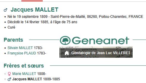 MALLé Jacques né vers 1809 dans le canton de SAINT SAVIN (86) DCD le 14/02/1885 à CHENAY curé de Chenay de 1881 à 1885. |