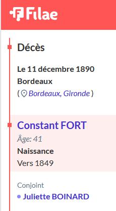 … A LA MEMOIRE DE CONSTANT FORT DECEDE A BORDEAUX LE 10 DECEMBRE 1890 A L'AGE DE 41 ANS ET A CELLE DE TOUS PARENTS ET ALLIES REPOSANT DANS CE CIMETIERE 8 SEPTEMBRE 1957