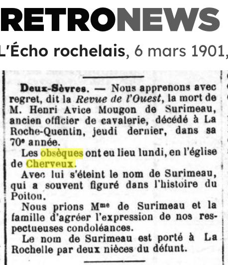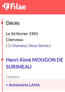 henri Avice de Mougon de Surimeau Né le 9 août 1831 Décédé le 28 février 1901 - la Rochequantin par Cherveux, 790 à l'âge de 69 ans Officier de cavalerie Parents Charles Amateur Avice de Mougon de Surimeau, marquis 1807-1869 Pauline Caroline de Mougon 1809-1880 Union Marié avec marie antoinette Lana