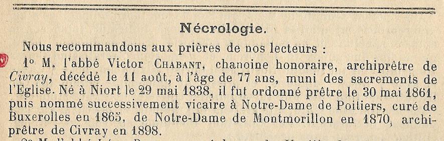 ICI REPOSE en attendant la Résurrection le corps de VICTOR CHABANT Chanoine honoraire curé archiprêtre de Saint Nicolas de Civray pendant 17 ans Décédé le 11 Août 1915 à l'âge de 77 ans Muni des sacrements de l'Eglise Miséricordieux Jésus donnez lui le repos éternel Indulgence de 7 ans et 7 quarantaines --