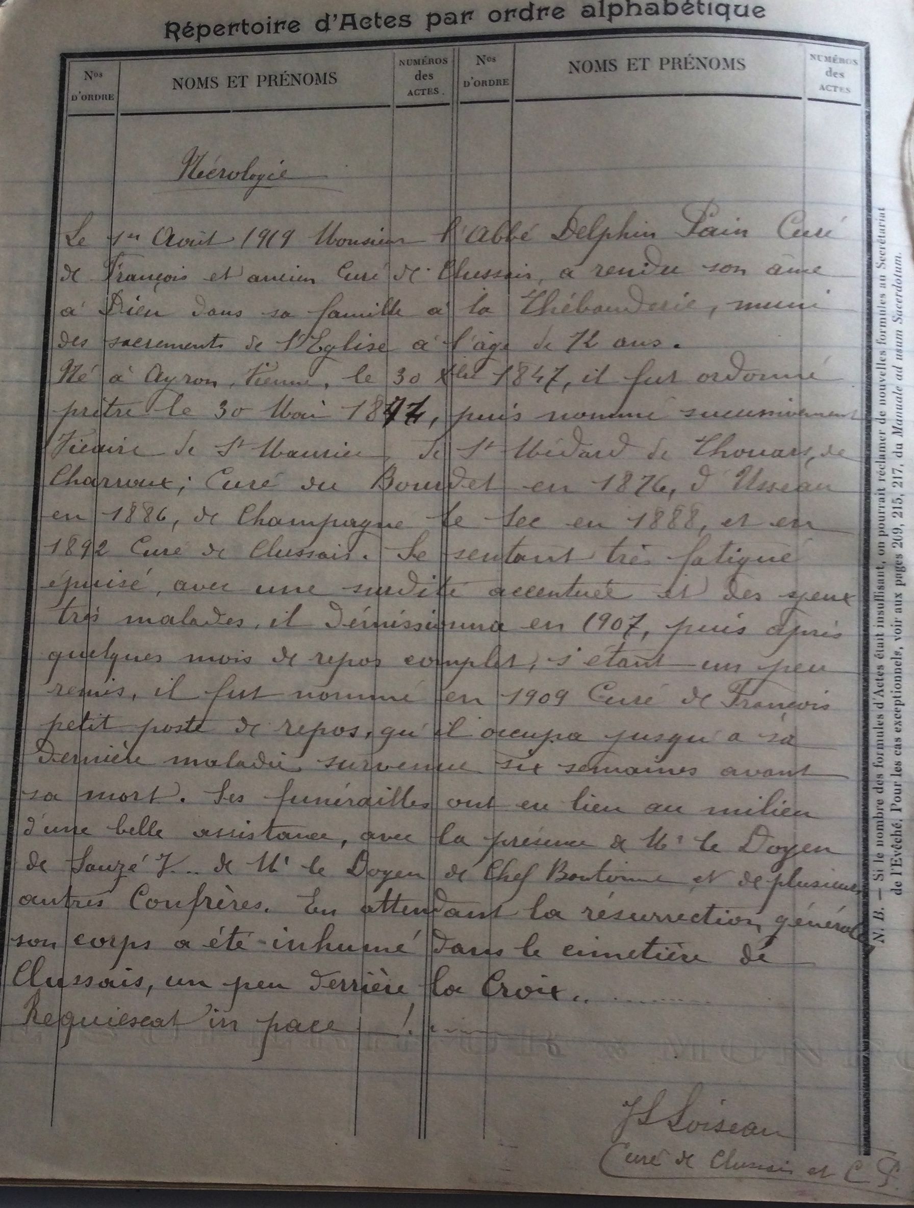 Document se trouvant dans le registre de la paroisse de CLUSSAIS année 1919 |