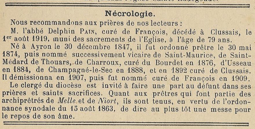 + DANS LA PAIX ICI Repose le corps de Delphin PAIN curé de François ancien curé de Clussais décédé le 1er Août 1919 à l'âge de 72 ans – Je vous ai choisi mon Dieu pour la part de mon héritage – Jésus – Marie – Joseph -- |