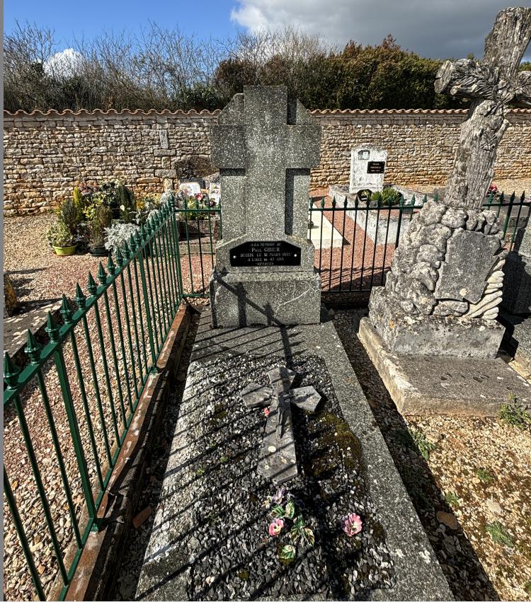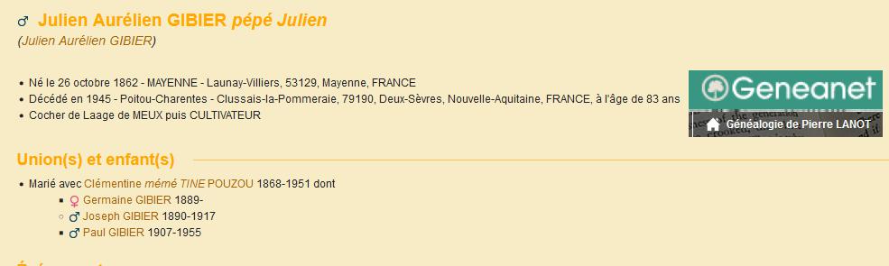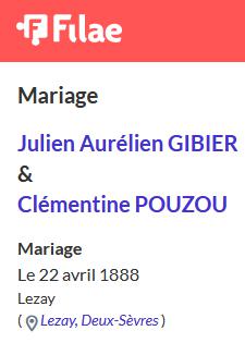 A LA MEMOIRE DE JULIEN GIBIER DECEDE LE 4 AOÛT 1945 A L'AGE DE 82 ANS CLEMENTINE POUZOU DECEDEE LE 6 FEVRIER 1953 A L'AGE DE 83 ANS REGRETS |