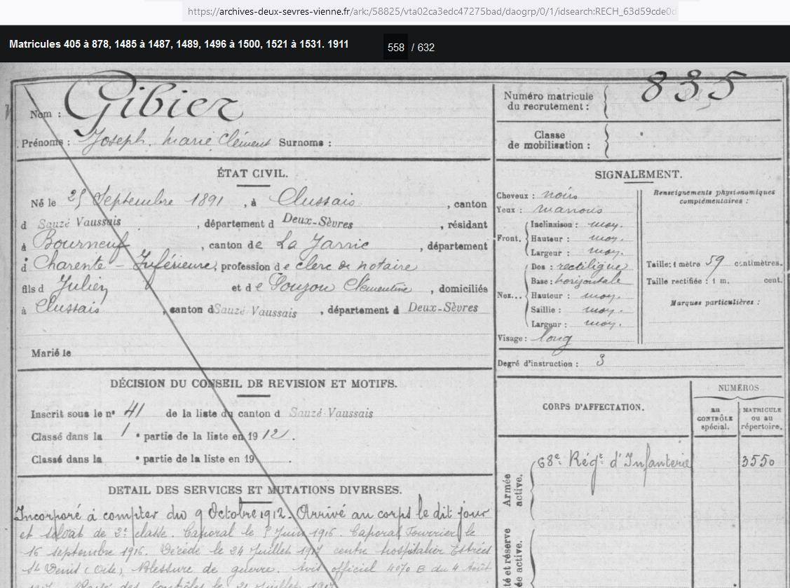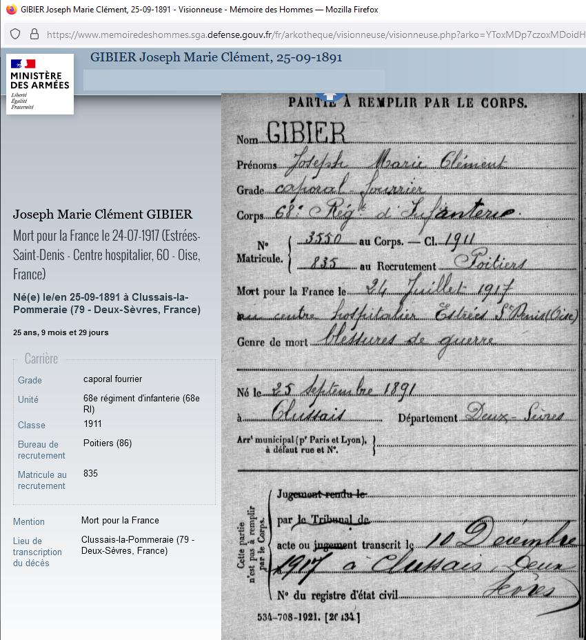 ICI REPOSE JOSEPH GIBIER LE 24 JUILLET 1917 A L'AGE DE 26 ANS