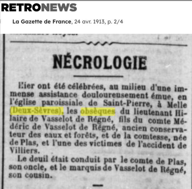 MARIE LOUIS HILAIRE VICOMTE DE VASSELOT DE REGNE 1ER AOUT 1878 TUE EN SERVICE AERIEN COMMANDE LE 17 AVIL 1913