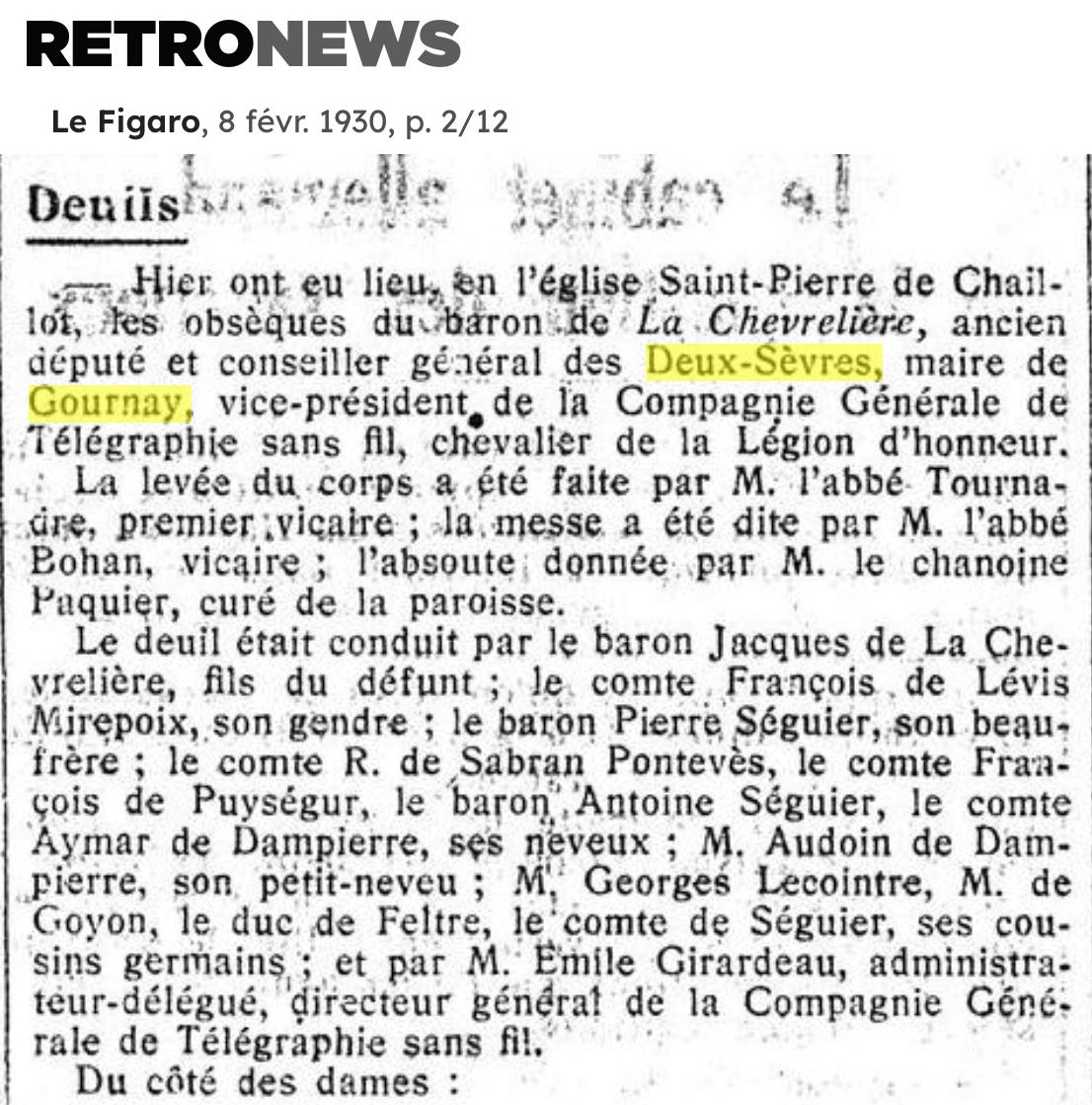 Ici Repose Jean, Marie, Charles AYME Baron de la CHEVRELIERE Chevalier de la Légion d'honneur Ancien officier de cavalerie Ancien capitaine d'Etat Major Ancien député des Deux-Sèvres Ancien conseiller général des Deux-Sèvres (1896-1928) Maire de Gournay (1893-1930) Vice président de la Cie générale de T.S.F. Vice président de la Cie Radio-Maritime Administrateur de la Cie Radio-France Administrateur de la Sté Française Radio-Electrique Président de la Cie Commle de l'Afrique Équatoriale Française décédé le 3 Janvier 1930 à l'âge de 71 ans