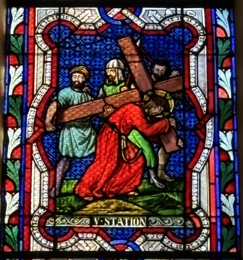 5e station : Simon de Cyrène aide Jésus à porter sa croix. |