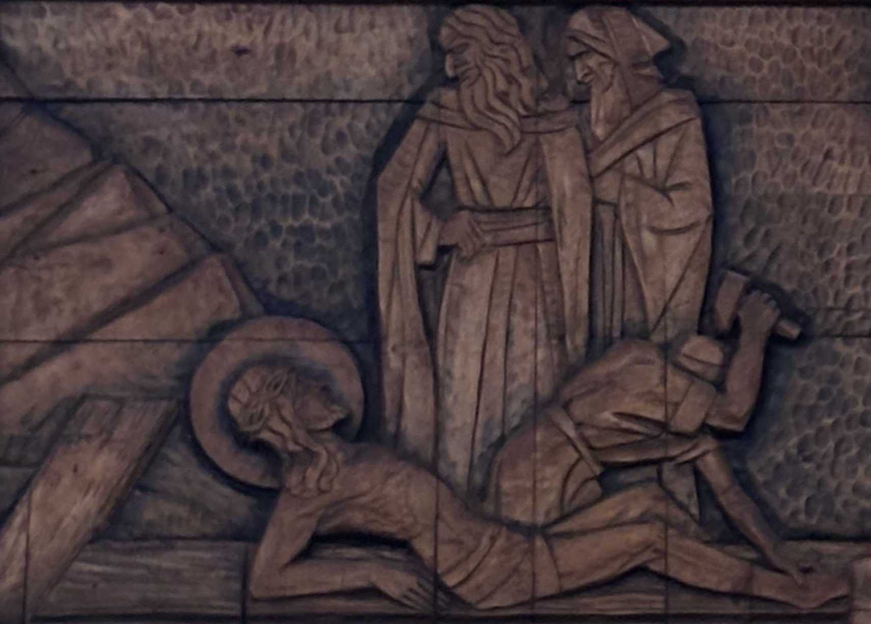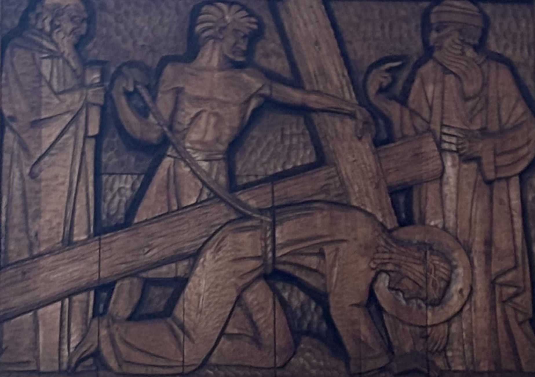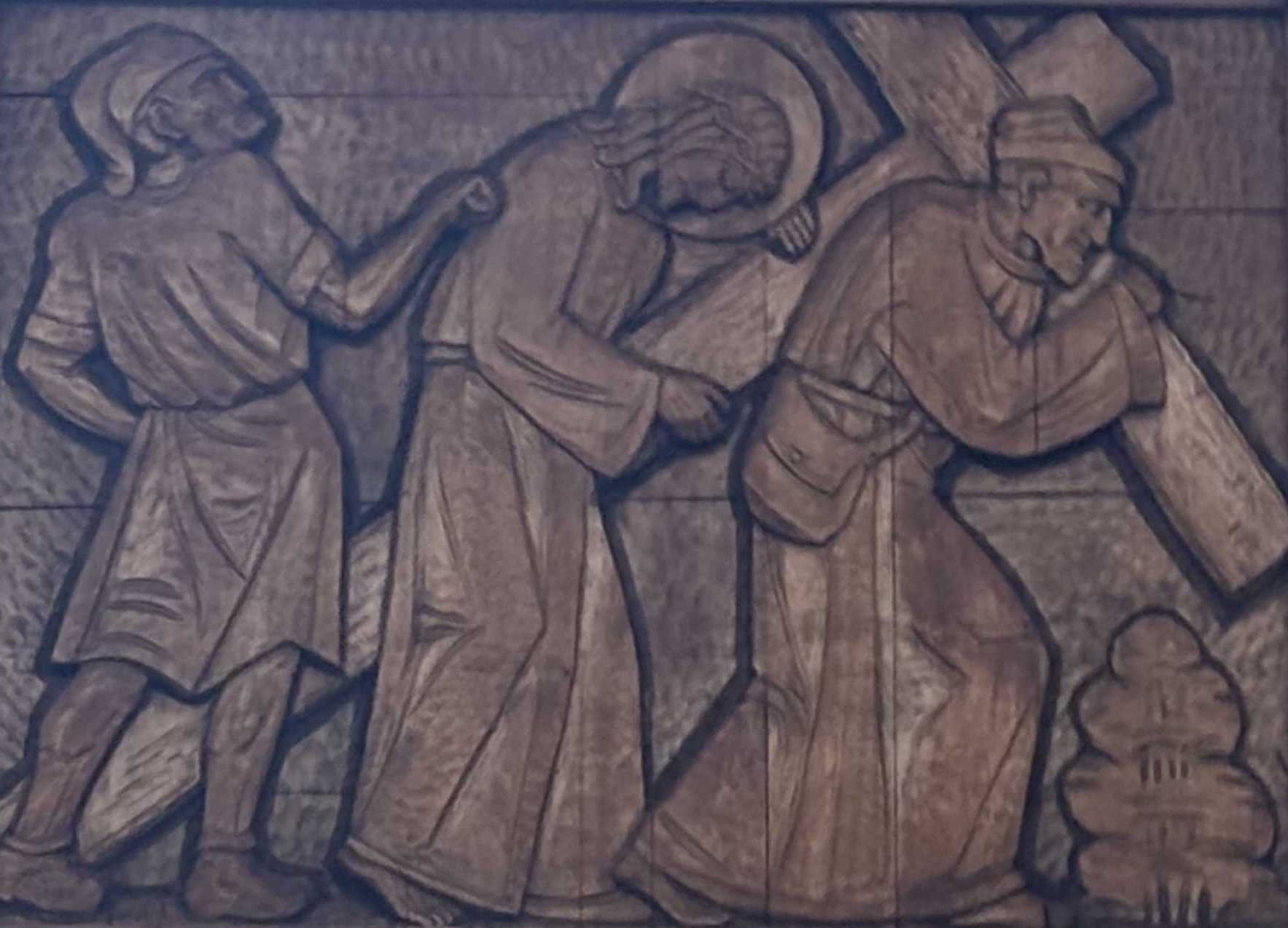 5e station : Simon de Cyrène aide Jésus à porter sa croix. |