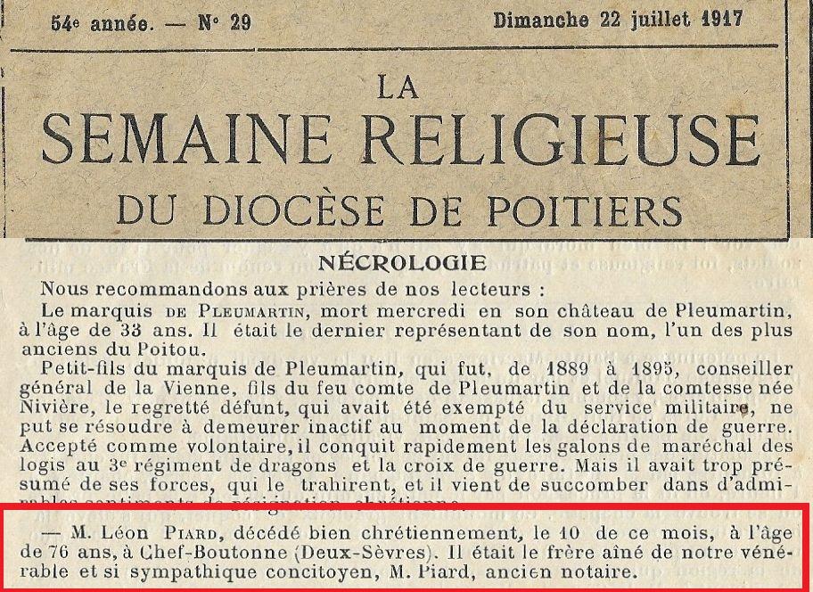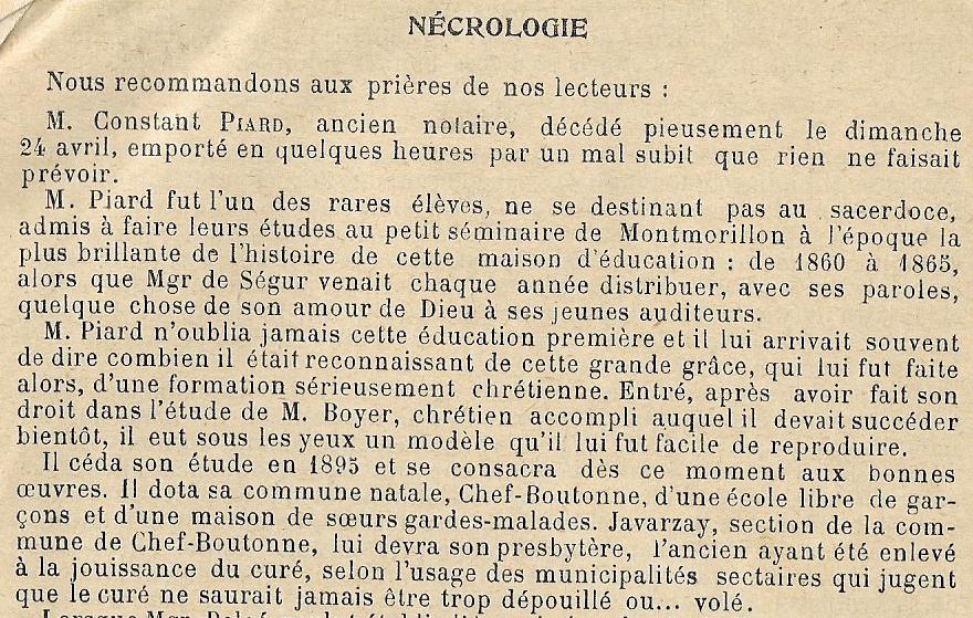 PIARD Constant né le 23/11/1844 à CHEF BOUTONNE fils de léonor PIARD (boulanger) et de PAPOT Marie son oncle PIARD Simon était clerc de notaire