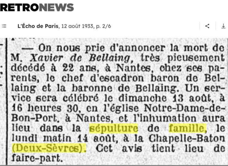 A NOTRE CHER PARRAIN REGRETTE HERVE MOREAU DE BELLAING DECEDE ACCIDENTELLEMENT A L'AGE DE .6 ANS LE 1ER JUILLET 1965