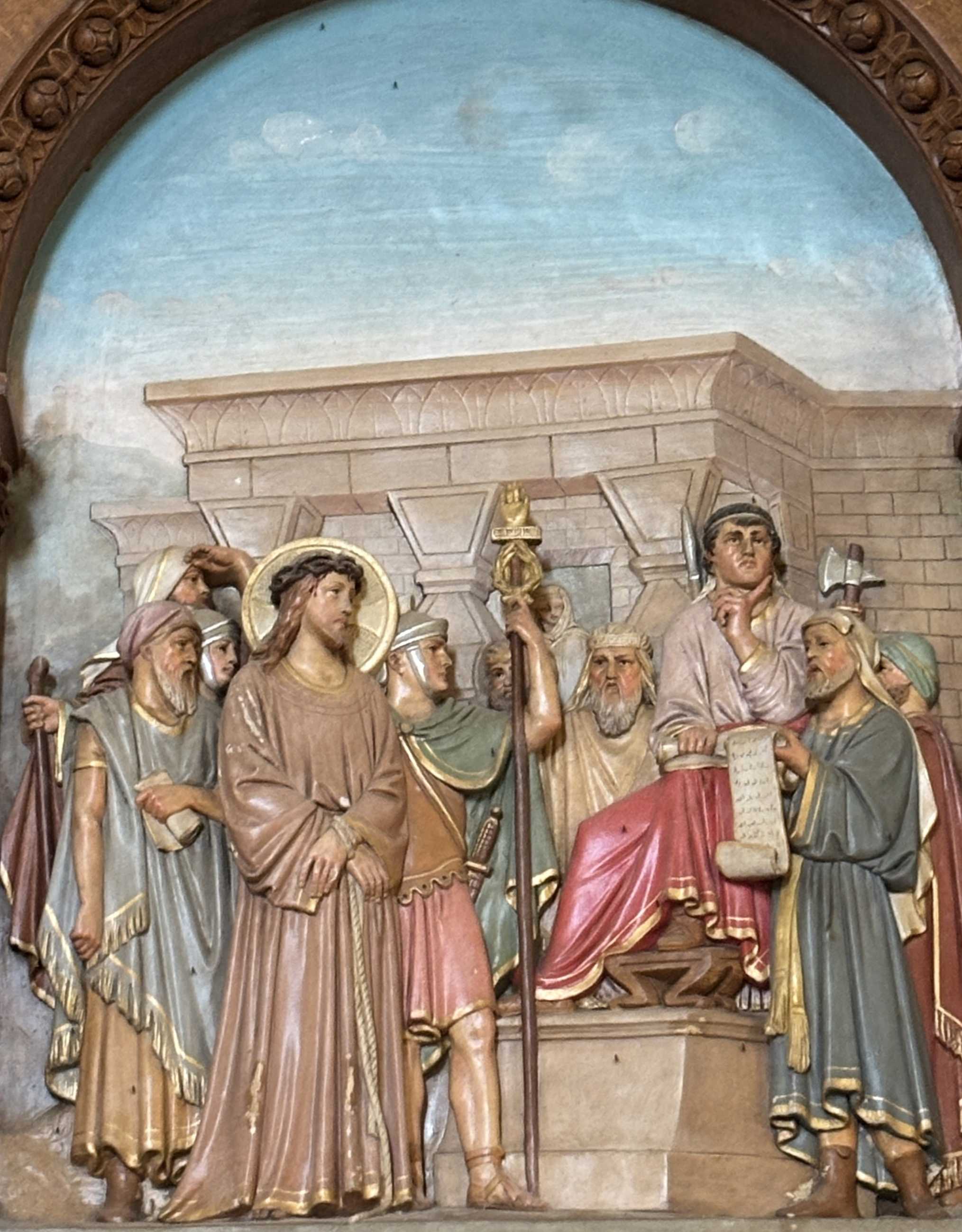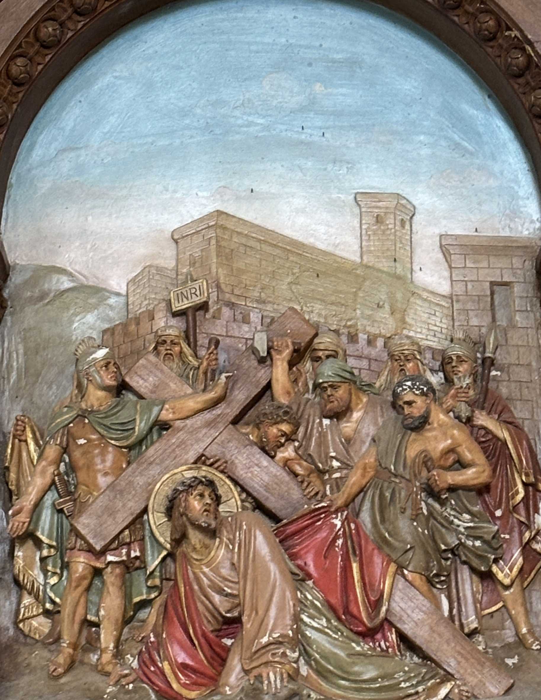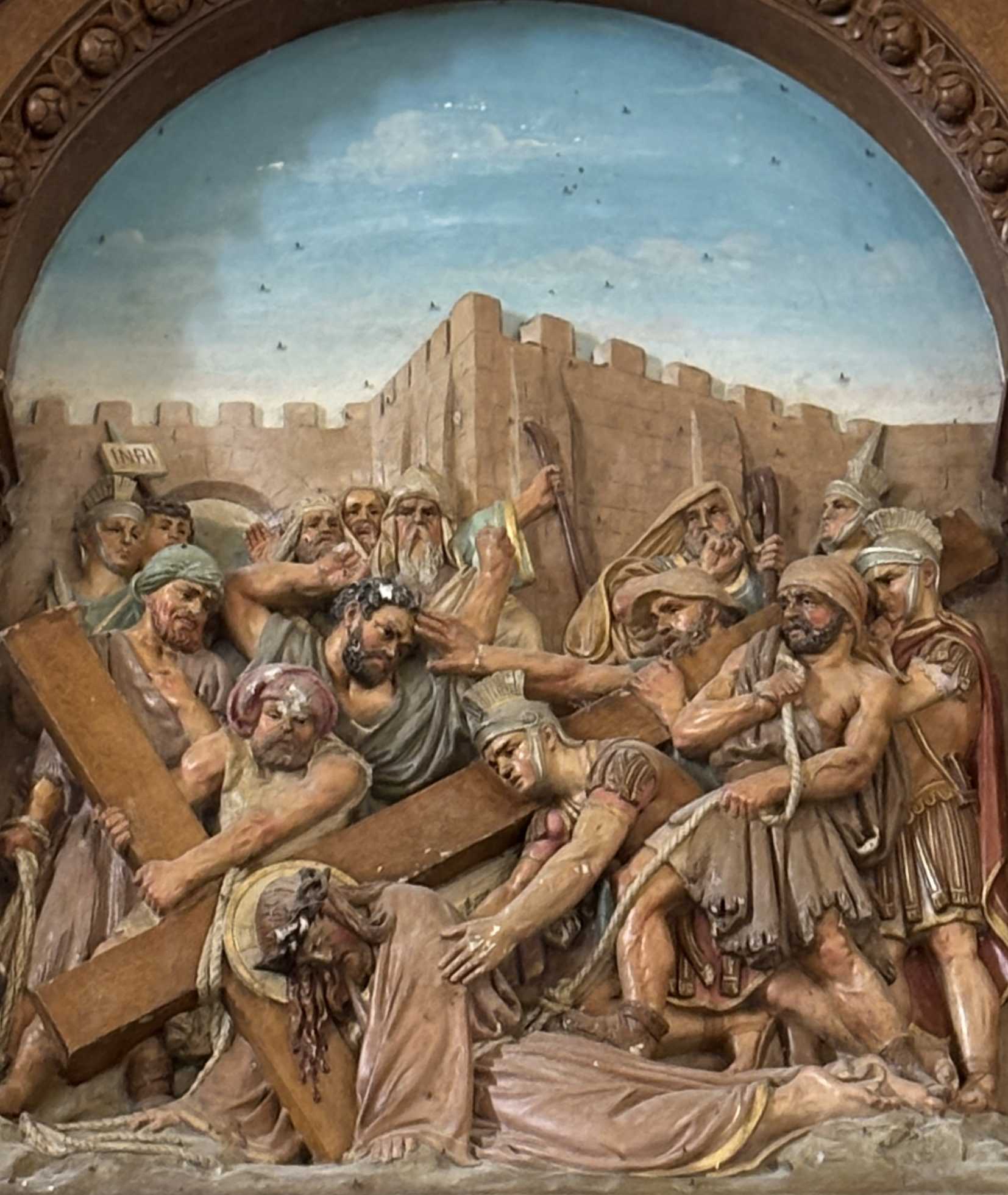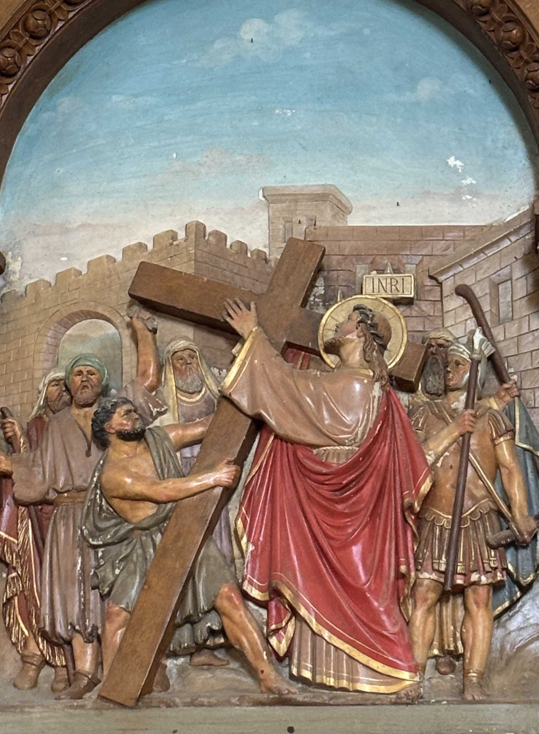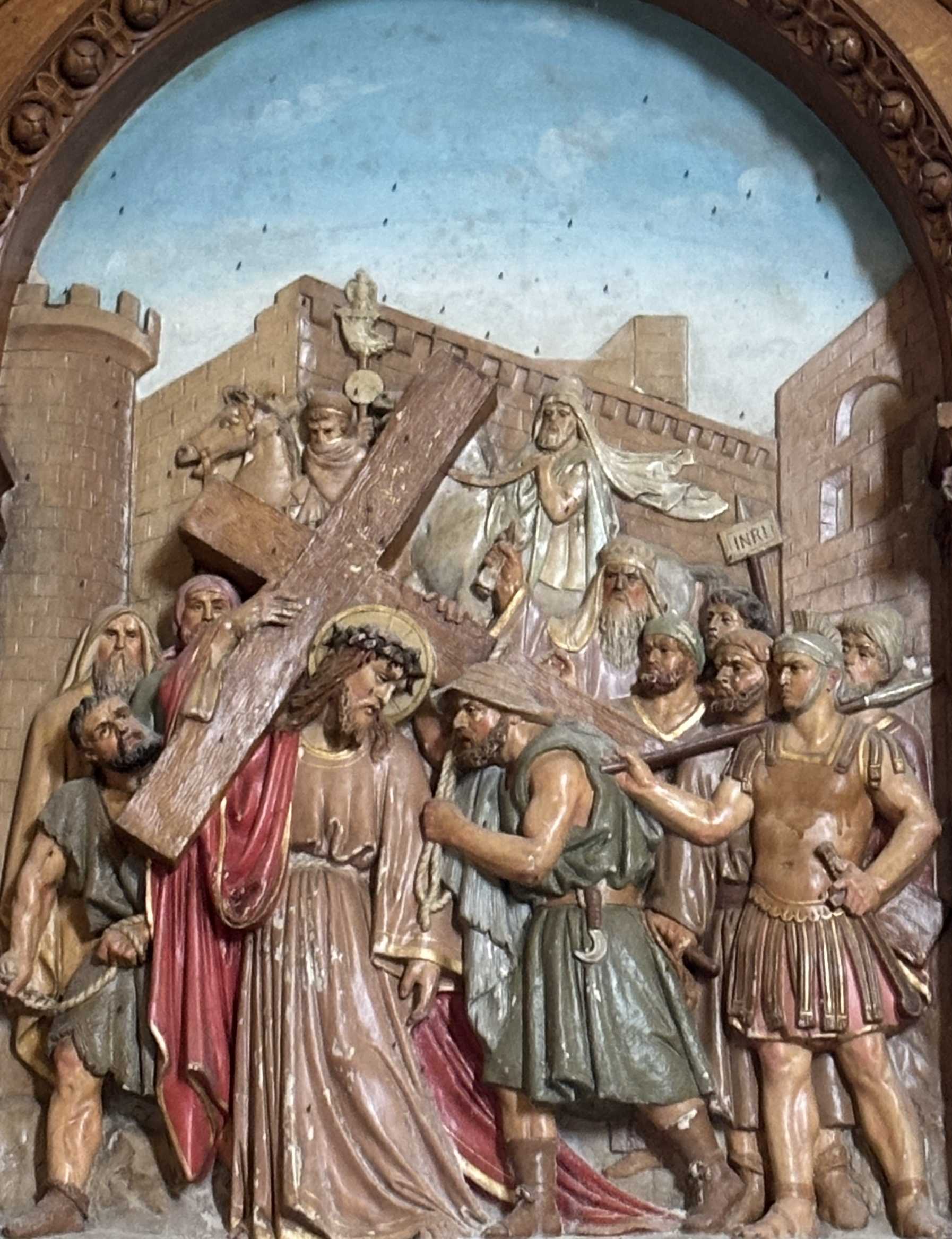 5e station : Simon de Cyrène aide Jésus à porter sa croix. |