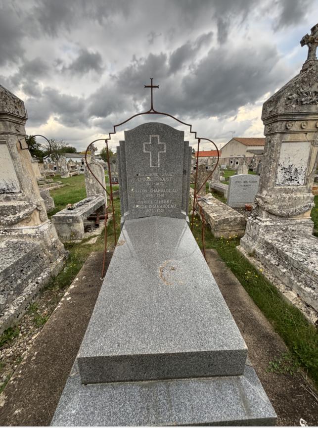 A la mémoire d'un digne époux et bon père Ci git le corps de monsieur Alexandre Volzer GILBERT époux de défunte dame Marie Agathe Alexandrine PROUST né à .. le 5 Avril 1835 décédé à Lezay le 30 Novembre 1894