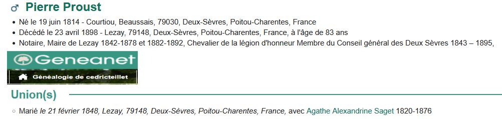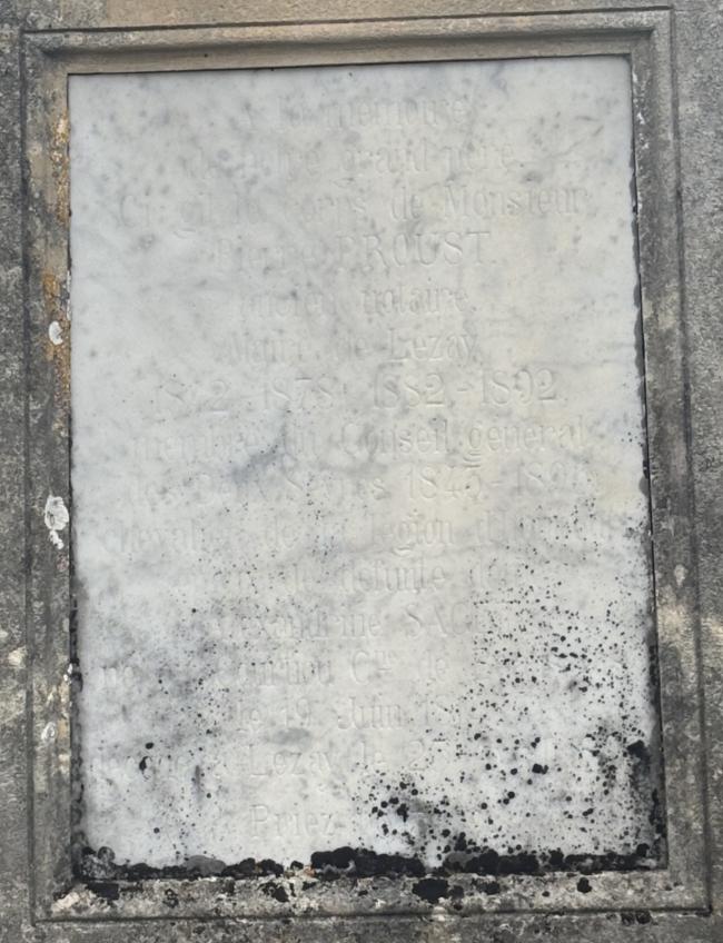 A la mémoire de notre grand père Ci git le corps de Monsieur Pierre PROUST ancien notaire maire de Lezay 1842 – 1878 1882 – 1892 membre du Conseil général des Deux Sèvres 1843 – 1895 chevalier de la légion d'honneur époux de défunte dame Alexandrine SAGET né au Courtiou Cne de Beaussais le 19 juin 1814 décédé à Lezay le 23 avril 1898