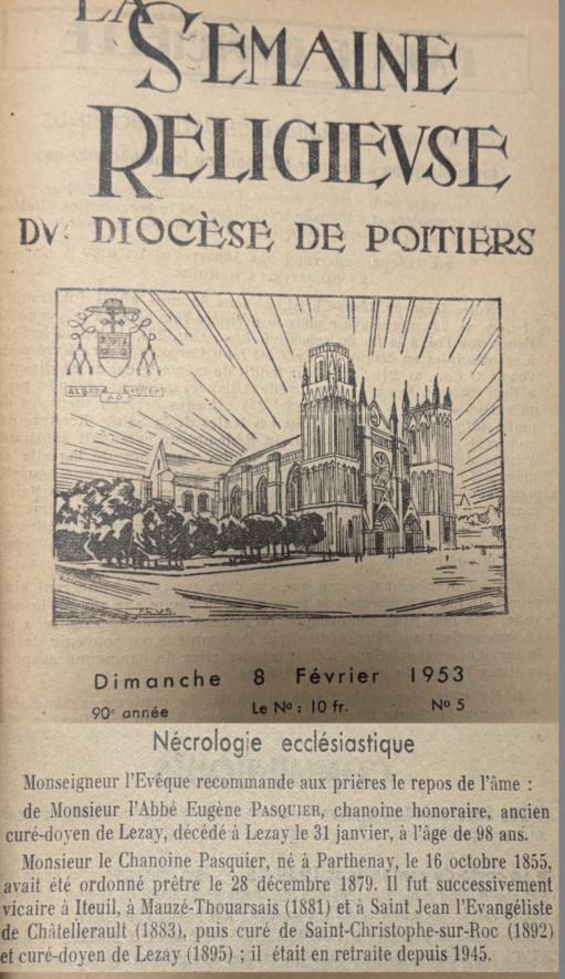 CHANOINE EUGENE PASQUIER CURE DOYEN DE LEZAY 1855 – 1953 CREDO VITAM ETERNAM |