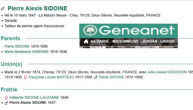 A LA MEMOIRE de Alexis SIDOINE Rté de Grie Dré Mlle Mre décédé à Lezay le 12 9bre 1917 dans sa 70ème année |