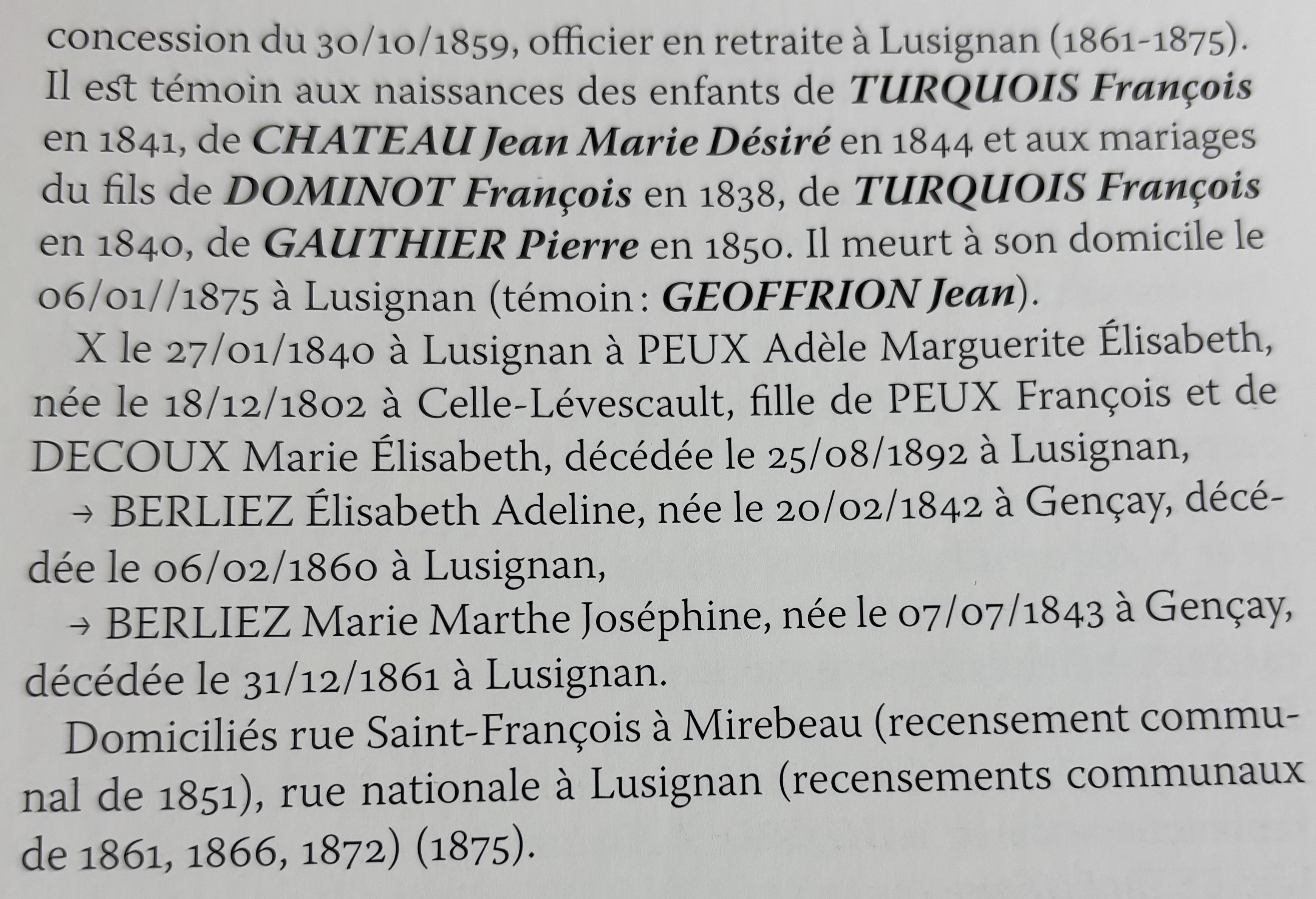 Elle Adèle Marguerite Élisabeth PEUX 37 ans née le 18/12/1802 à CELLES LEVESCAULT (86) domiciliée avec ses parents propriétaires à LUSIGNAN (86)