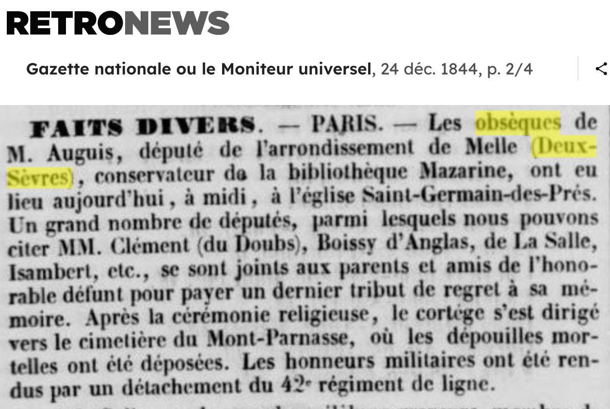 Pierre René Auguis est un homme politique français né le 6 octobre 1783 à Melle et décédé le 21 décembre 1844 à Paris. Biographie Fils de Pierre-Jean-Baptiste Auguis, il est professeur de littérature, puis sert comme militaire en France et en Hollande. Auteur connu sous la Restauration, il collabore à de nombreuses revues et verse volontiers dans la polémique et le scandale. Il est emprisonné de 1815 à 1817. Il est député des Deux-Sèvres de 1831 à 1844, siégeant dans l'opposition. Il est spécialiste des questions budgétaires. Il est nommé conservateur de la bibliothèque Mazarine en 1842, ce qui le rapproche de la majorité.