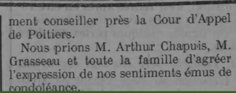FAMILLE GRASSEAU Zélia GRASSEAU . 16 avril 1903 . 68 ans Andrée GRASSEAU épouse de Arthur CHAPUIS 25 avril 1916 30 ans Charlotte BOURSIER épouse de André GRASSEAU Conseiller à la Cour 15 Septembre 1937, 79 ans André GRASSEAU Chevalier de la Légion d'Honneur Conseiller à la Cour d'Appel 28 -1-1946
