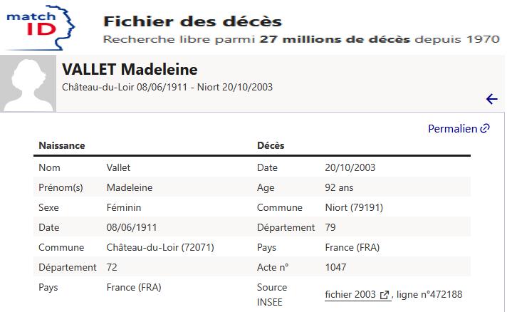 Après le DC de sa première il s'est remarié le 16/01/1962 à MELLERAN avec VALLET Madeleine |