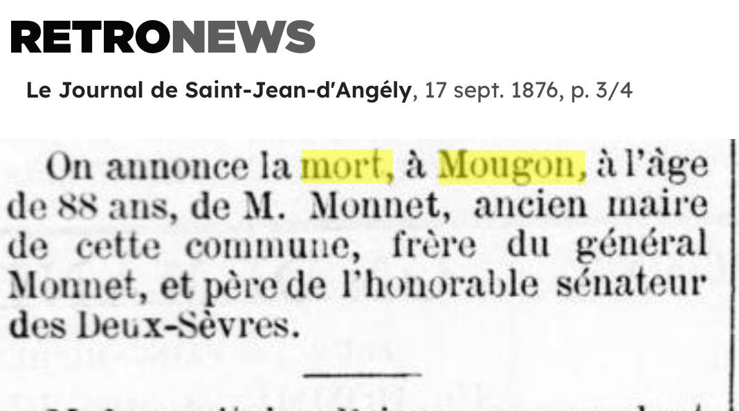 Ici repose la dépouille mortelle de Alfred MONNET né à MOUGON le 17 Xbre 1820. Ancien maire de Mougon, ancien maire de Niort. ancien député à l'assemblée Nationale, ancien Sénateur du département des Deux Sèvres Chevalier de la légion d'honneur décédé à Paris le 8 Juin 1890 à l'âge de 69 ans – Il avait pris la loi de Dieu pour règle de sa vie toute entière Priez pour lui.