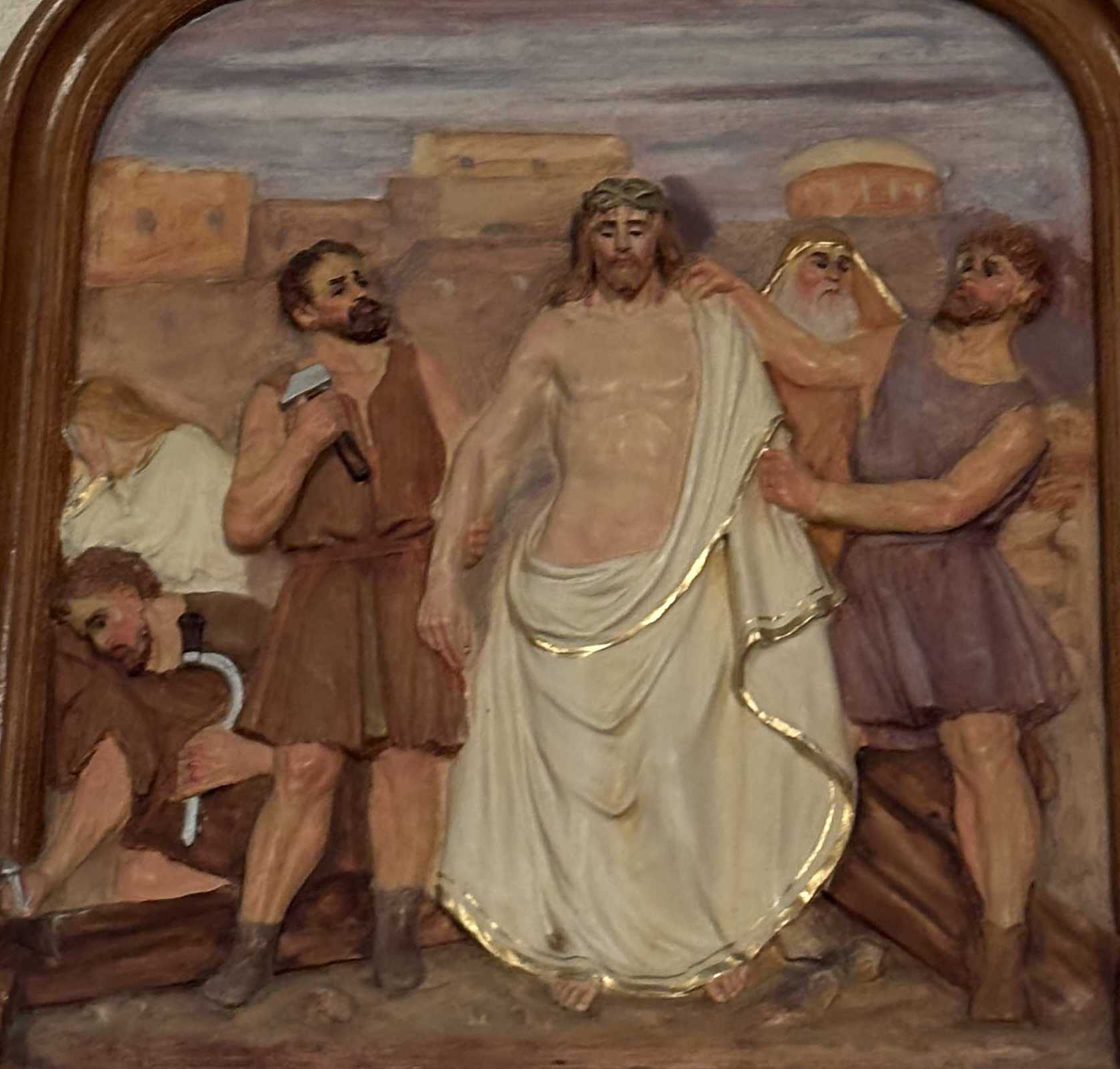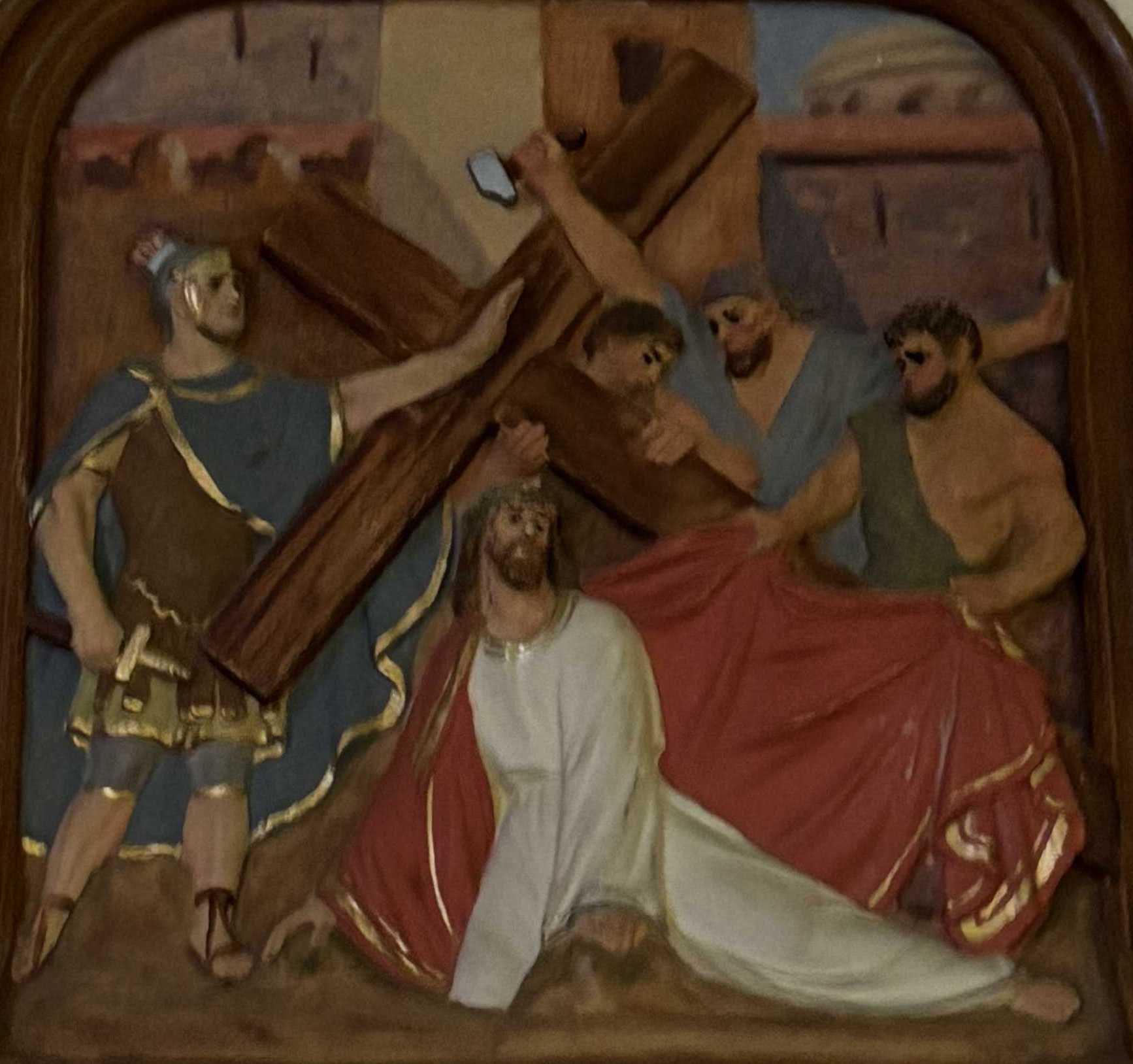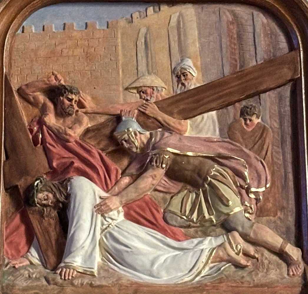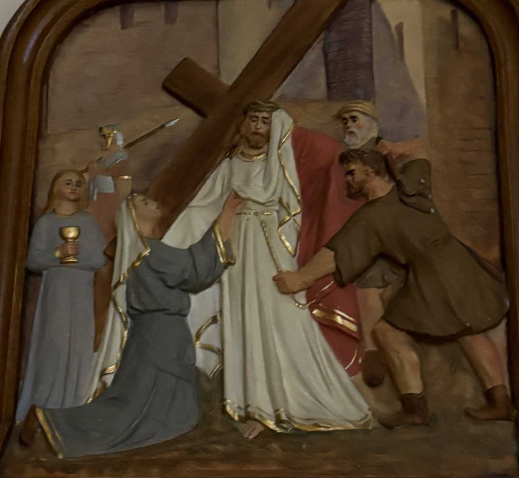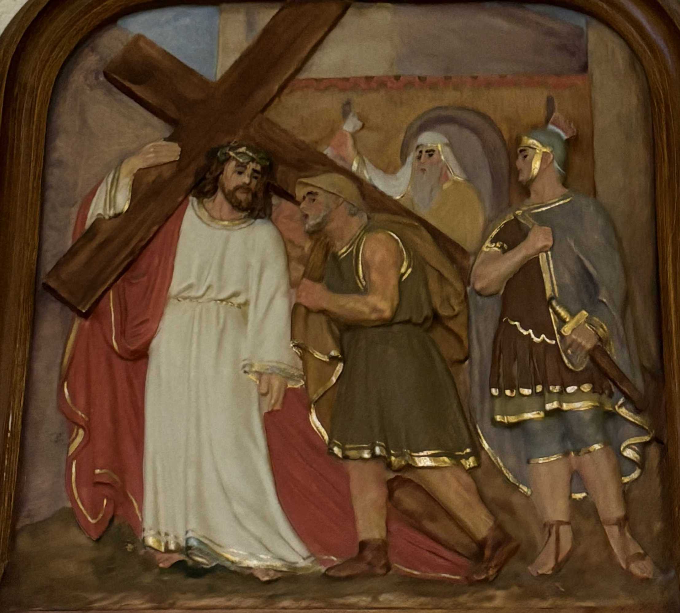 5e station : Simon de Cyrène aide Jésus à porter sa croix. |