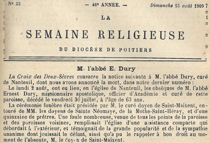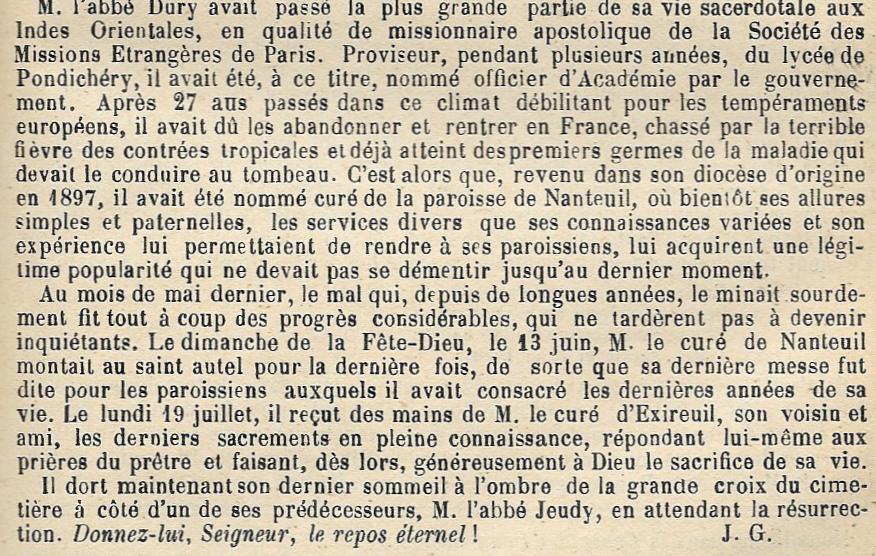 A Mr l'abbé Ernest DURY Missionnaire Apostolique curé de Nanteuil décédé le 30 Juillet 1909 à l'âge de 62 ans. |