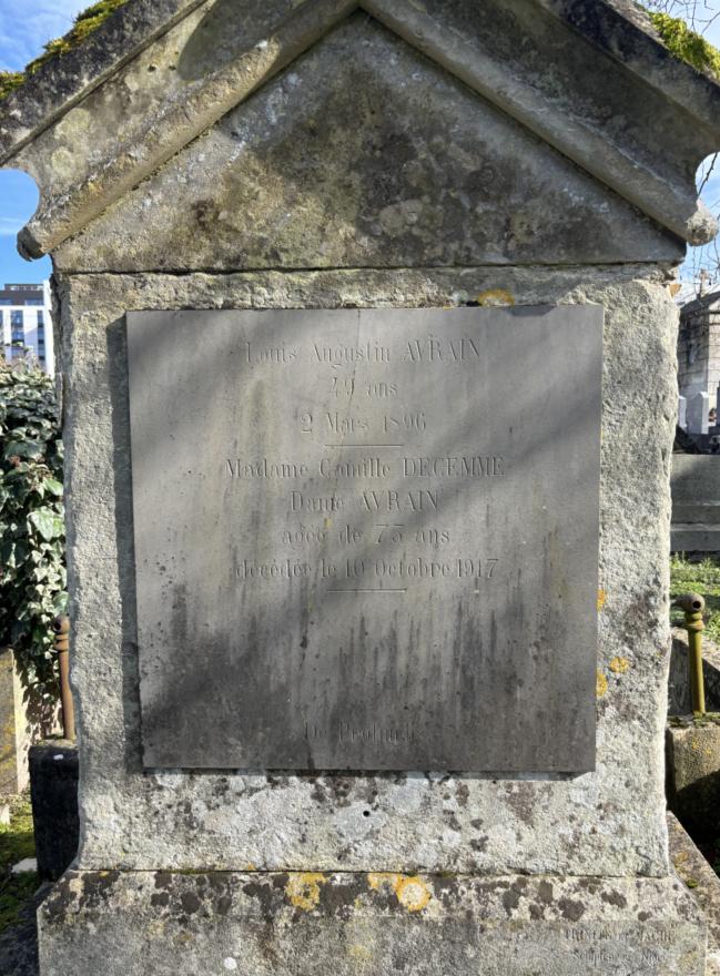 Louis Augustin AVRAIN 49 ans 2 Mars 1896 – Madame Camille DECEMME Dame AVRAIN agée de 73 ans décédée le 10 Octobre 1917 –