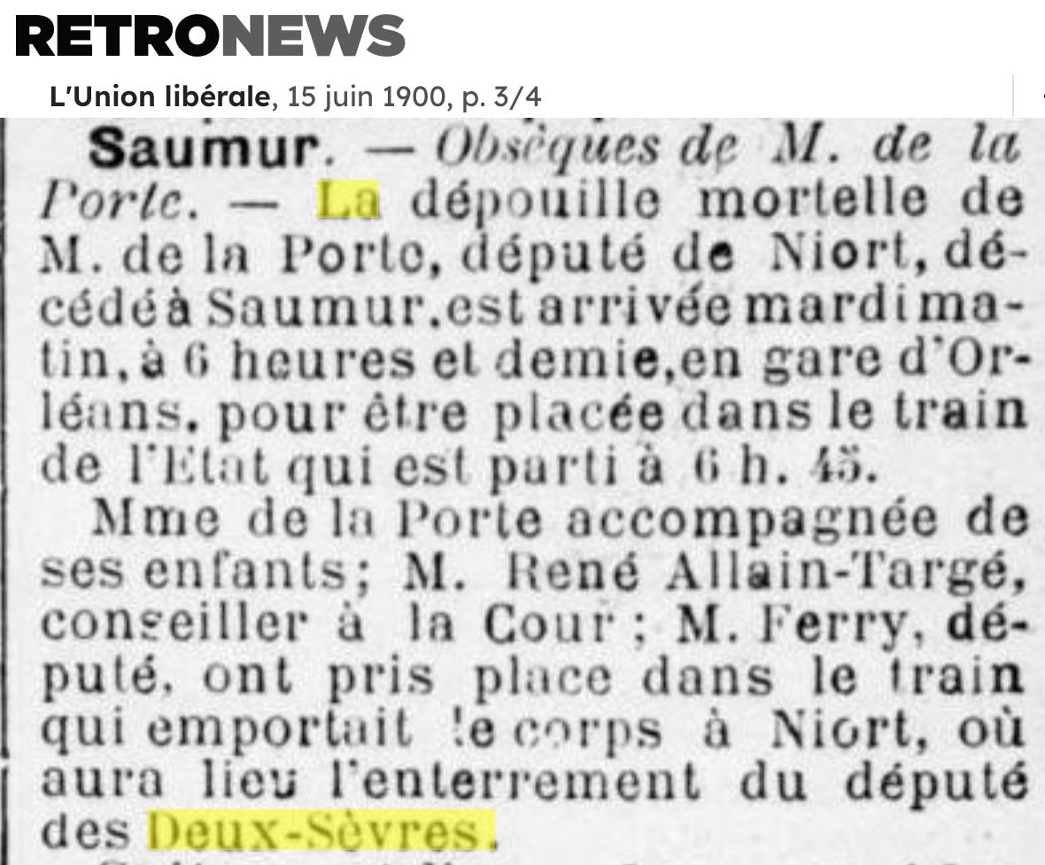 ICI REPOSENT Pharamond Amédée de la PORTE directeur de l'Enregistrement des domaines et du timbre né en 1800, mort le 17 Mars 1865 – Et son épouse Marie Aimé Eugénie MANES 13 Mai 1815 – 14 Août 1888 – Et leur fils 20 Juin 1848 – 10 Juin 1900 Capitaine des mobiles des Deux-Sèvre Sous Secretaire d'Etat aux Colonies Président
