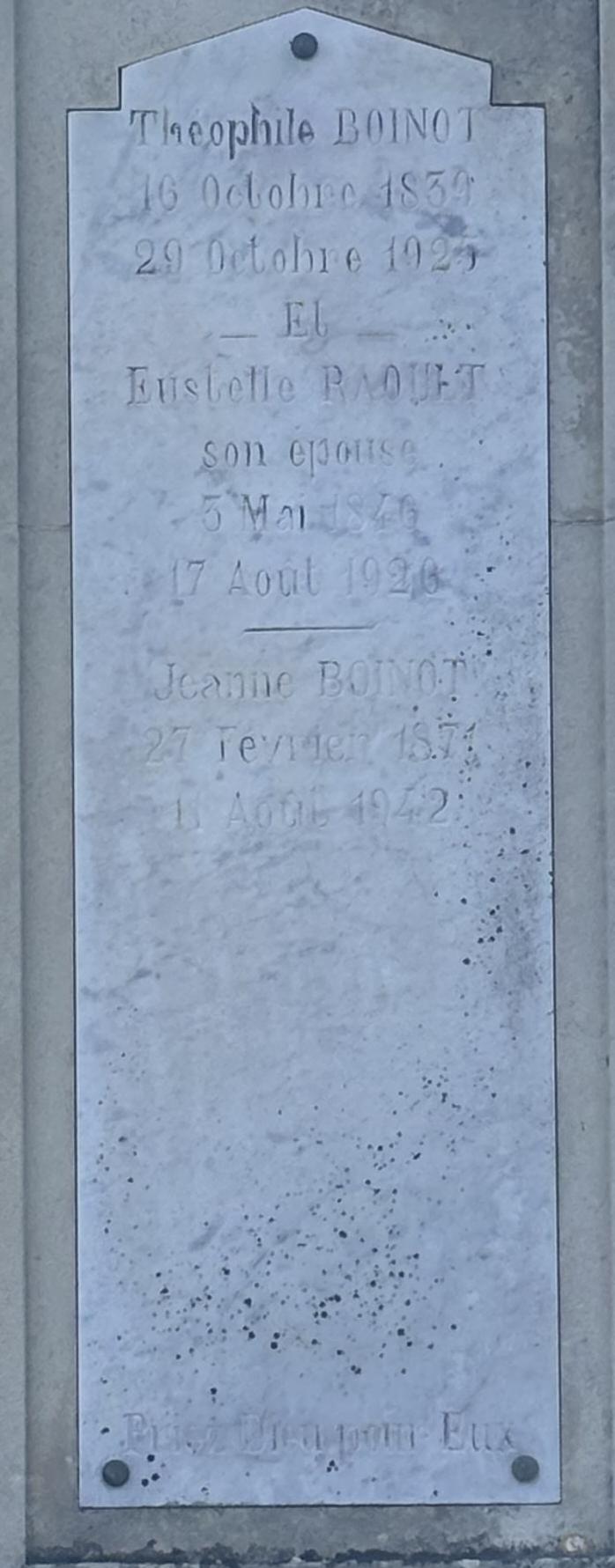 Théophile BOINOT 16 Octobre 1839 29 Octobre 1925 -Et- Eustelle RAOULT son épous 3 Mai 1846 17 Août 1926 – Jeanne BOINOT 27 Février 1871 11 Août 1942 |