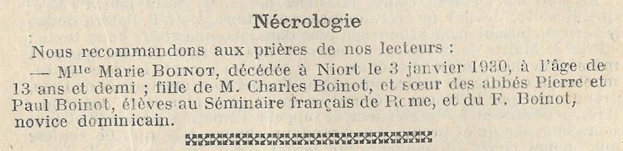 Marie BOINOT 13 Mai 1916 3 Janvier 1930 – Mme Charles BOINOT née Thérèse FRAGNAUD 1 Février 1882 2 Mars 1944 – Charles BOINOT 16 Janvier 1877 24 Septembre 1952 – Jacques BOINOT 5 Avril 1907 17Novembre 1967