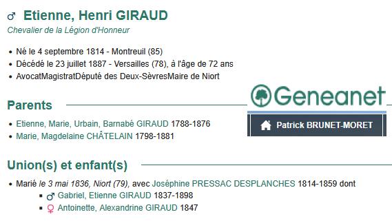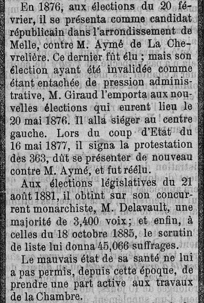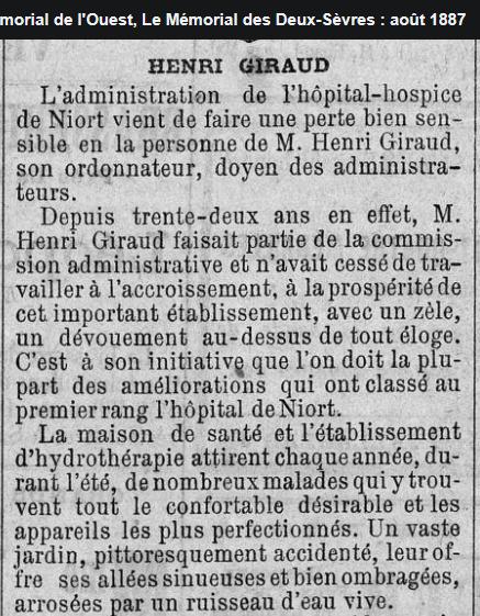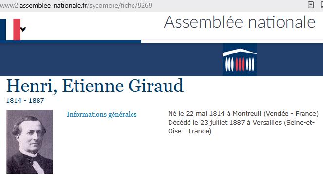 Henri Giraud est reçu avocat en 1835 et inscrit au barreau de Niort, il est nommé juge puis président, durant vingt-deux années, au tribunal civil de la ville. Elu maire de Niort le 19 août 1848[[#ref_1]], il démissionna après le coup d'Etat du 2 décembre 1851. Giraud présida la Société d'agriculture des Deux-Sèvres et le comice agricole de Niort. Fondateur en 1857 du mensuel "La Fraternité", il est l'instigateur de la reprise éditoriale de l'Almanach de "Frère Jacques" - en mémoire de Jacques Bujault cultivateur à Sainte-Blandine. Député de l'arrondissement de Melle du 21 mai 1876 à la fin de sa vie. Il rallia, en janvier 1882, de sa voix de républicain de la gauche démocratique, celles des conservateurs dans un vote qui causa la chute du gouvernement de Léon Gambetta. Giraud a été en 1880 le rapporteur[[#ref_2]] sur la création d'un port en eau profonde à La Pallice près de La Rochelle. Ardent propagateur du mouvement mutualiste[[#ref_3]] et longtemps à la tête des secours mutuels de sa ville, il présida à Paris la Société d'encouragement au bien, et la Société philantropique du prêt gratuit, et assura la vice-présidence de la Société française des amis de la paix.