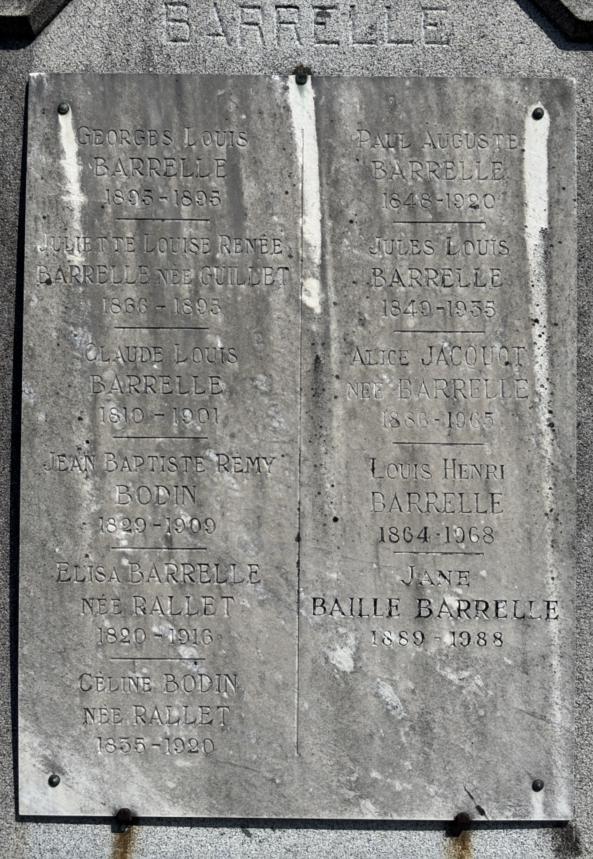 GEORGES LOUIS BARRELLE 1895 – 1895 – JULIETTE LOUISE RENEE BARRELLE NEE GUILLET 1866 -1895 – LAUDE LOUIS BARRELLE 1810 – 1901 – JEAN BAPTISTE REMY BODIN 1829 – 1909 – ELISA BARRELLE NEE BALLET 1820 – 1916 – CELINE BODIN NEE RALLET 1835 - 1920 |